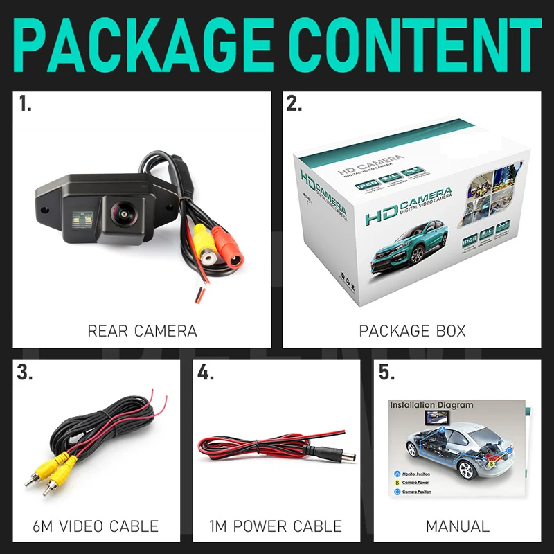 1. Камера заднего вида FS-HD2. Самонарезающий винт и коробка3. Видеокабель 6 м4. Кабель питания5. Руководство