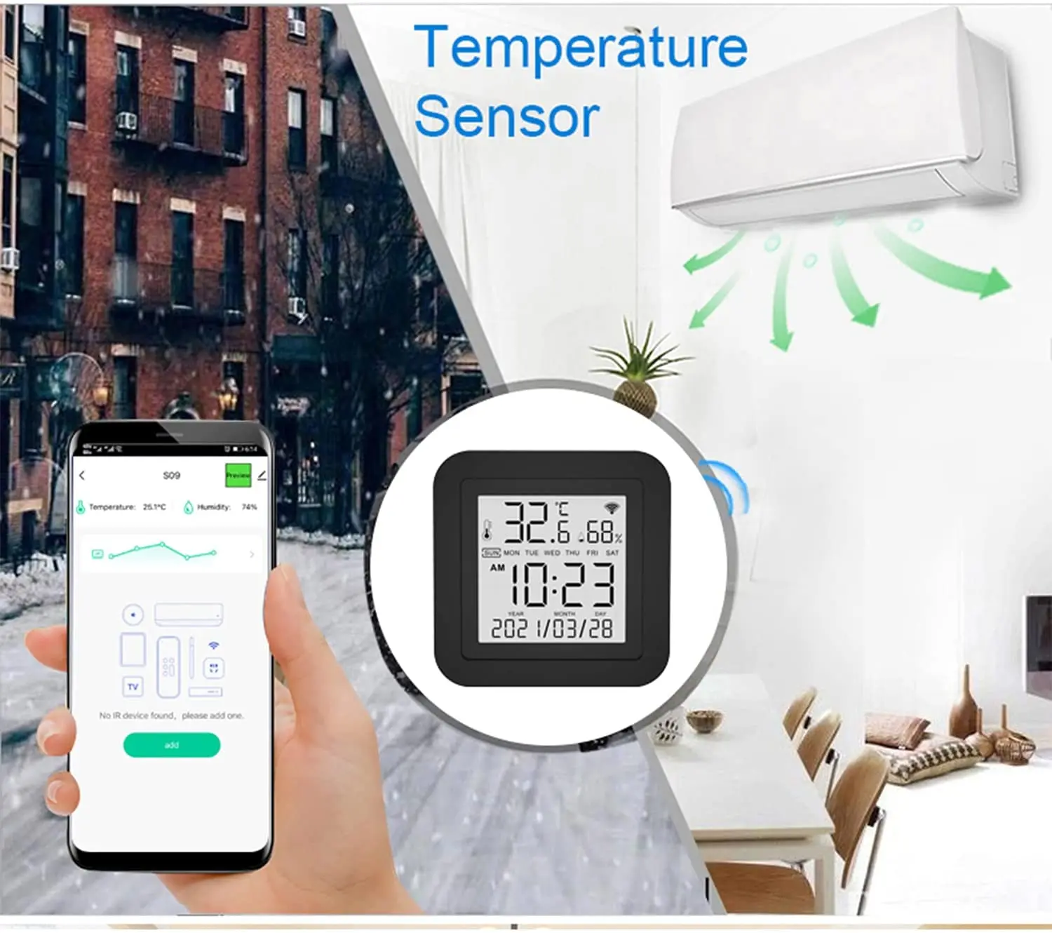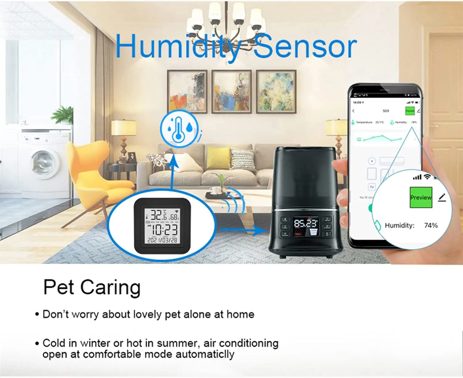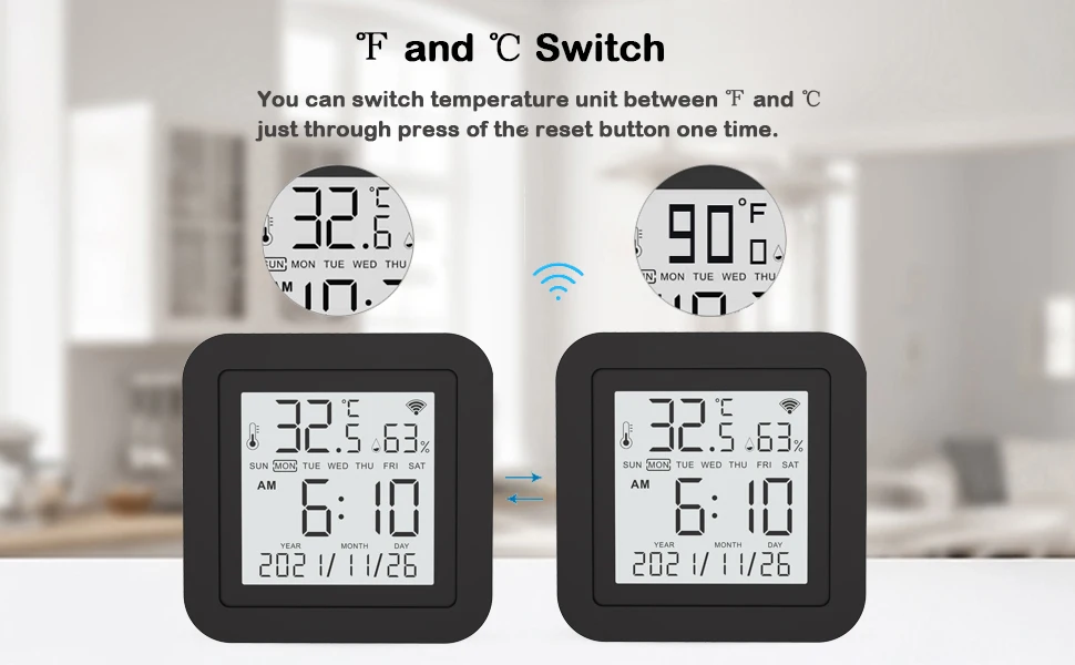 С помощью встроенного датчика вы можете узнать температуру и влажность в помещении в любое время. И в соответствии с их значениями, делайте последующую автоматизацию. Например, включите кондиционер, когда температура выше 26 ℃, и включите увлажнитель, когда влажность меньше 50%.