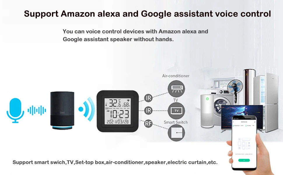 Подключив приложение к Amazon Alexa, Google Home, вы сможете управлять своей бытовой техникой голосом. Например:-Алекса, включи телевизор;-Ок, Google, установите температуру кондиционера до 25 градусов.Примечание:1. Этот продукт признан универсальным пультом дистанционного управления на Amazon Alexa и Google Home и не может быть признан датчиком температуры и влажности.2. Наши продукты не будут отображаться на Amazon Alexa и Google Home, только приборы, добавленные к нашим продуктам, и вы можете управлять ими только голосом.