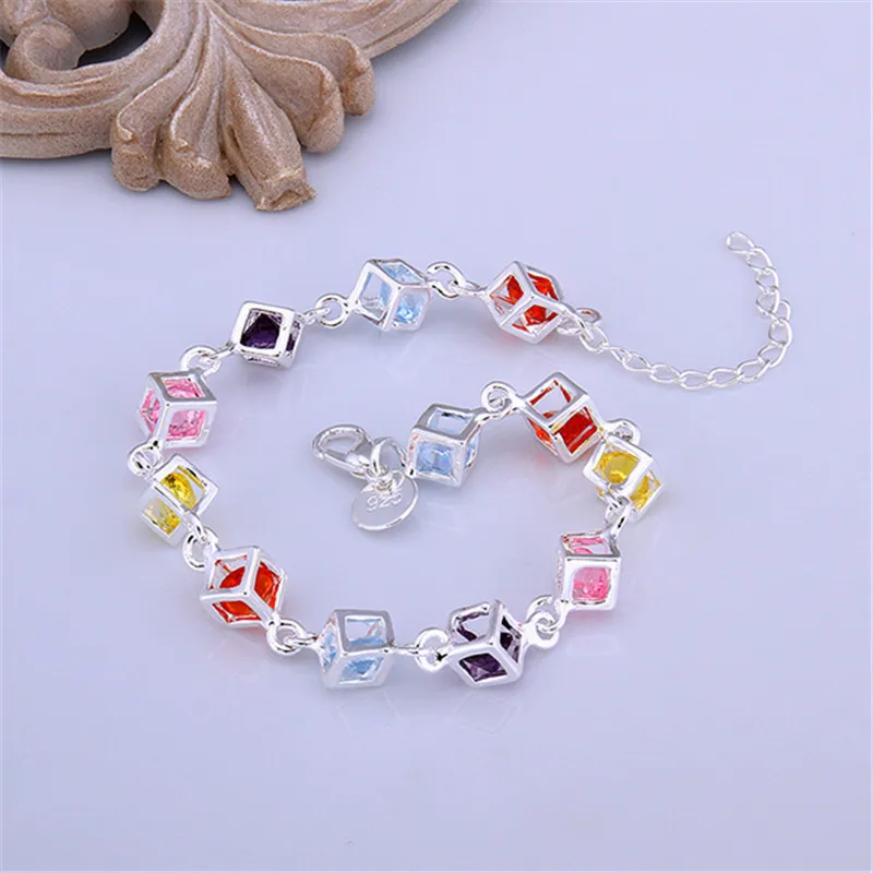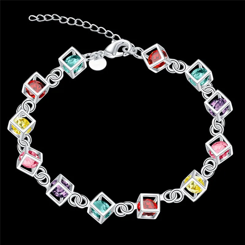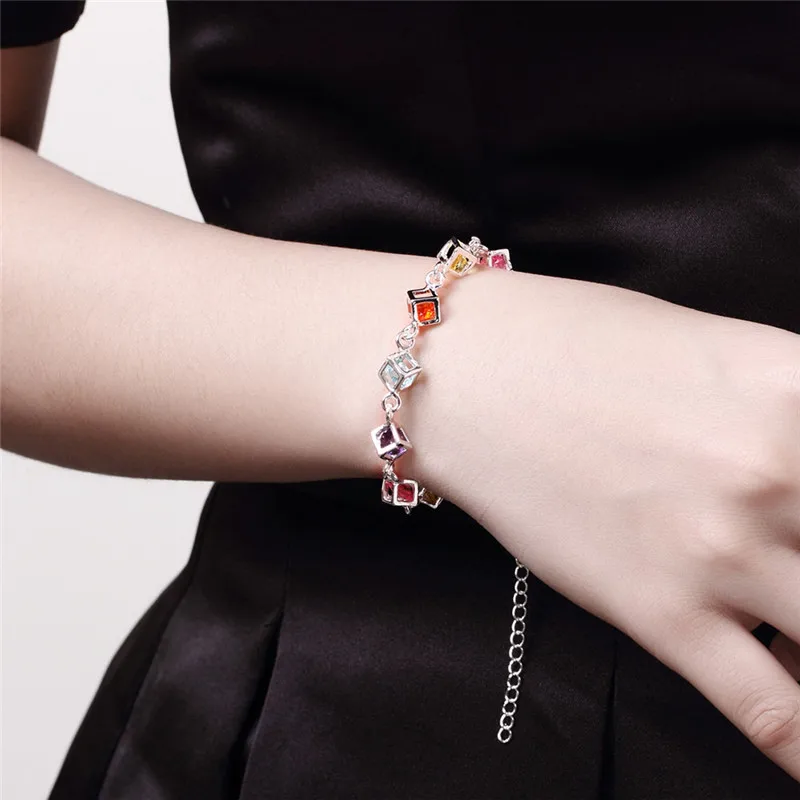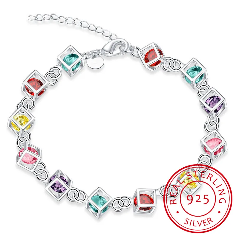 LEKANI горячая Распродажа Блестящий Кристалл CZ счастье куб 925 стерлингового серебра Женские Девушка Браслет Разноцветные Cube Радуга, хорошее ювелирное изделие