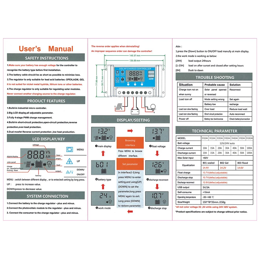 Описание: 1. Две функции MPPT + PWM: Этот продукт автоматически адаптируется к режиму зарядки (MPPT/PWM) и автоматически настраивается и заряжается в соответствии с типом аккумулятора. Например, литиевые батареи должны использовать метод зарядки MPT, как те, которые перезаряжаются 12 В кислотные батареи используют метод зарядки PWM. 2. Большой ЖК-дисплей, дисплей заряда и разрядки, кумулятивный запрос электроэнергии и разрядки, дисплей температуры, светильник управления + контроль задержки; Регулируемые параметры заряда и разряда, С памятью отключения питания и другими функциями. 3. Двойной выход USB, максимальный ток 2.5A, поддерживает мобильный телефон Apple зарядка. Оснащен всеми необходимыми защитными устройствами, параметры управления системы регулируются, легко настраиваются и работают. 4. Встроенная защита от короткого замыкания, защита от открытого замыкания, защита от обратного соединения, защита от перегрузки. Защита от обратного тока, низкая теплотворная способность, с функцией самовосстановления, не повредит контроллер. Особенности: 1. Отображение температуры в реальном времени, зарядный ток и ток разряда 2. Текущий Автофокус MPPT отслеживание зарядки, высокая эффективность зарядки, процесс зарядки не останавливает обнаружение, двустороннее отслеживание фокуса. 3. Зарядка 12V /24V литиевая батарея, супер широкий заряда и разряда регулируемый 4. Минуты регулируются, когда выход выключен, что более удобно (нет регулировки, когда рынок только доступен). 5. Встроенный перегрев, перегрузки по току, короткого замыкания, защита от открытого замыкания, устранение неисправностей, автоматическое восстановление контроллера 6. Двусторонняя трубка MOS с защитой от обратного потока, режим зарядки высокой мощности, сверхнизкое тепло. 7. R5.0 разъем постоянного тока для солнечной зарядки, R5.0 выход лампы постоянного тока, легко подключить Описание мощности PV системы: 30A / 40A / 50A/ 60A /100A аккумуляторные батареи 12V фотоэлектрической системы: мощность составляет соответственно 360W, 480W, 600W, 720W , 840W 30A / 40A / 50A / 60A/ 100A батарея 24V фотоэлектрической системы: мощность составляет соответственно 720W, 960W, 1200W,1440W, 1680W Спецификация: Название: Солнечный контроллер с ЖК-экраном Напряжение: 12 В/24 В постоянного тока Дисплей: ЖК-экран Самопотребление: <10 мА Защита от избыточного заряда благодаря: 14,4 V/28,8 V Перезарядка Поплавковый заряд: 13,7 в/27,4 В Восстановления заряда напряжение: 12,6 V/25,2 V Защита от перегрузки: 10,7 В/21,4 в По сравнению с восстановление сброса: 12,6 V/25,2 V Двойной выход USB: 5 В/2 А (зарядка мобильный телефон, iPad и т. д.) Рабочая температура: -35 ℃ -60 ℃ 12V подходит 18V панели солнечных батарей, 24V подходит для е-байка 36В панели солнечных батарей 12,0 вольт свинцово-кислотная батарея соответствующая Напряжение поплавка устанавливается на: 13,6 Восстановительное напряжение разряда устанавливается на: 12,6 Напряжение отключения разряда устанавливается на: 10,7 12,8 вольт литиевая железная фосфатная батарея, соответствующая Напряжение поплавка устанавливается на: 14,6 Восстановительное напряжение разряда устанавливается на: 13,6 Напряжение отключения разряда устанавливается на: 11,0 11,1 вольт литиевая батарея соответствующая Напряжение поплавка устанавливается на: 12,6 Восстановления разрядное напряжение установлен: 11,6 В критическое разрядное напряжение устанавливается: 9,6 Функция: 1. Всегда держите б