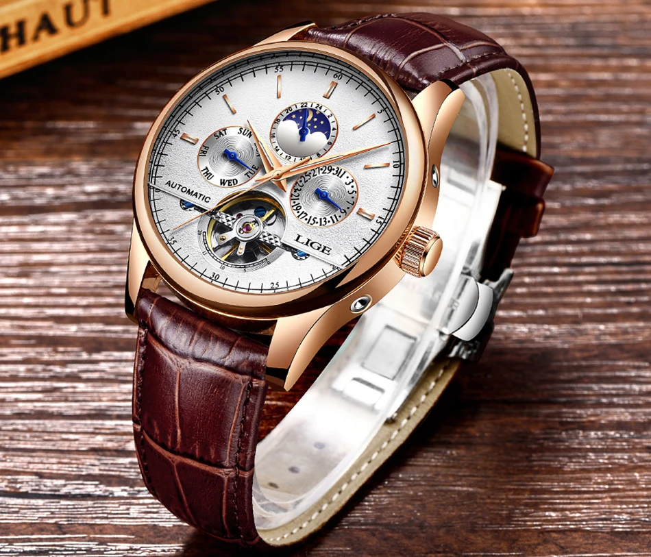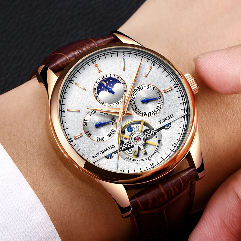 Часы наручные LIGE Мужские автоматические, механические Водонепроницаемые многофункциональные с кожаным ремешком, с месяцем, фазой недели