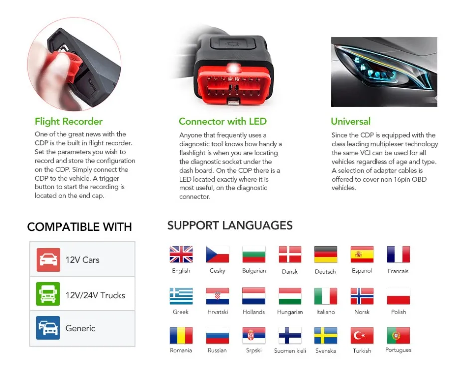 Регистратор полетаС функцией записи полетов вы можете записывать параметры в режиме реального времени во время вождения автомобиля. Во время записи, вы можете с помощью нажатия кнопки, подчеркнуть конкретную ошибку, чтобы вы могли изучить обнаруженную ошибку в более позднее время. Он оснащен встроенной памятью, тем самым устраняя необходимость приносить компьютер. Карта памяти не входит в посылка.Многоцветный индикаторС разноцветным индикатором на нем вы полностью контролируете процесс диагностики. Различные цвета и звук передают статус и размещение индикатора позволяет увидеть его издалека. Например, если индикатор чередуется между синим и зеленым, он находится в общении с устройством управления транспортным средством.Проверка напряженияПри подключении к транспортному средству устройство проверяет напряжение батареи транспортного средства и Автоматически подстраивается под уровень напряжения транспортного средства в 12 или 24 вольт. Если напряжение становится слишком высоким или слишком низким, Это предупредит вас как звук, так и светильник, и вы также будете оповещены через значок батареи в нашем диагностическом программном обеспечении.Номер шасси VINВ нашем программном обеспечении для автомобилей у нас есть умная функция, которая позволяет считывать номер шасси с транспортного средства, который вы хотели бы диагностировать. Это гарантирует, что правильная модель и год будут выбраны автоматически. Кроме того, код двигателя для транспортных средств, которые широко доступны на рынках, также выбирается автоматически.МКСИнтеллектуальная система сканирования (МКС) сканирует все системы в транспортном средстве и отображает коды неисправностей, которые хранятся в каждой системе. Это экономит время, и вы получите быстрый обзор фактического состояния всего транспортного средства. После завершения работы МКС вы можете выбрать конкретную систему управления для дальнейшего анализа результатов.ISIИнтеллектуальная идентификация системы (ISI) определяет и автоматически выбирает Тип контроллера, который установлен в транспортном средстве. Это гарантирует, что диагностический сеанс выполнен правильно с правильными параметрами по мере необходимости.Функция отчетаВ рамках этой функциональной вкладки вы сможете увидеть приспособления и корректировки, которые возможны для конкретного транспортного средства, не имея транспортного средства рядом с вами. Вместе с справочными текстами в качестве руководства, вы можете спланировать и быть эффективными в своей работе; Даже в сложных ситуациях.OBD-FUNCTIONSОн оснащен уникальной технологией мультиплексора, которая позволяет использовать его на всех типах транспортных средств, независимо от уровней напряжения и стандартов связи. Для тех транспортных средств, которые не используют стандартный 16-контактный диагностический разъем, мы предлагаем полный набор сертифицированных и индивидуальных адаптеров кабелей и комплектов.УниверсальныйДля большинства функций OBD, таких как настройки и программы, есть подробные инструкции и справочные сообщения, которые помогут вам в диагностической работе. Вы найдете пошаговую информацию о предварительных условиях, подготовке и реализации различных функций; Делая даже самую сложную функцию простой в выполненииВспомогательная функц
