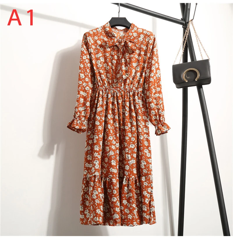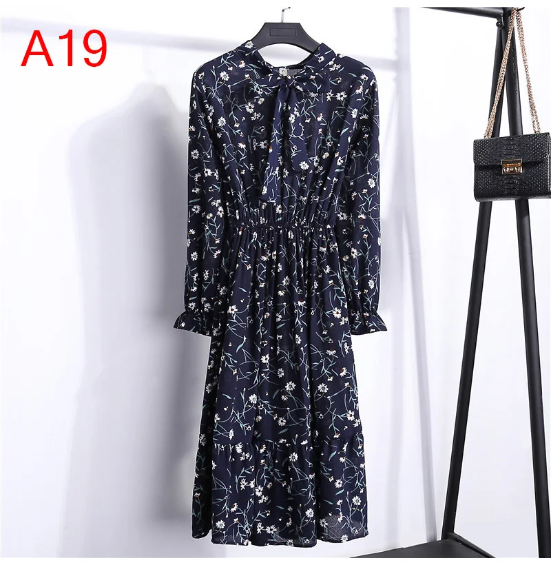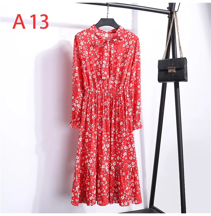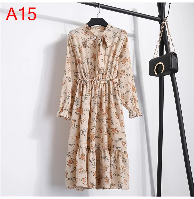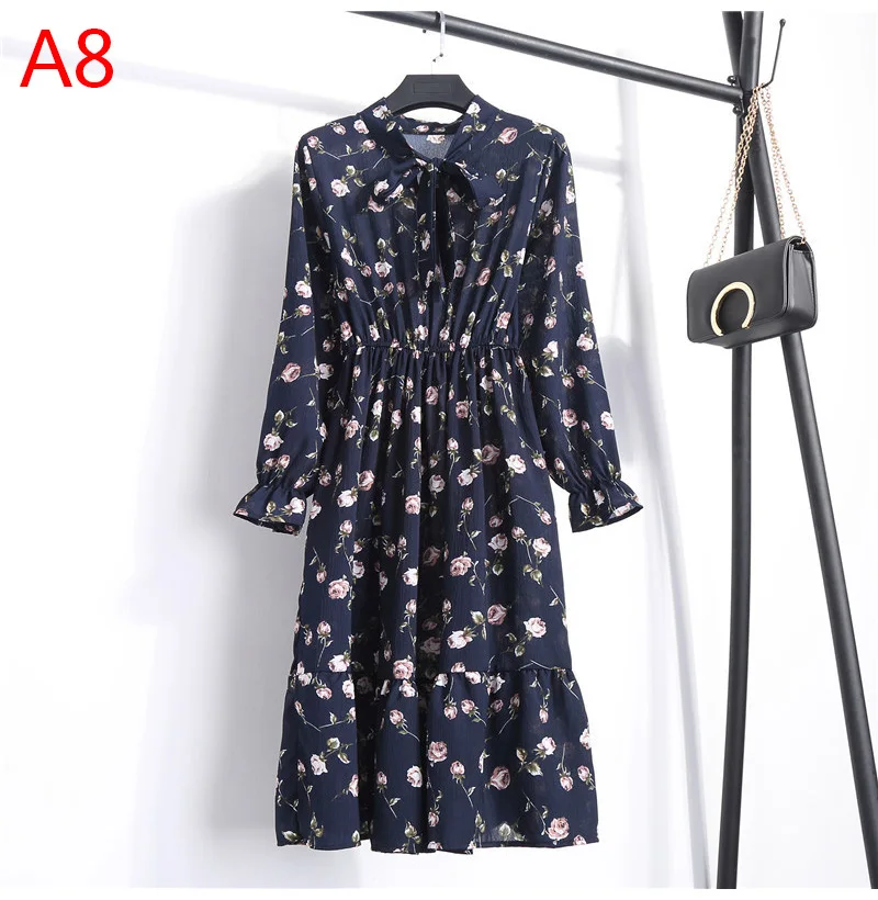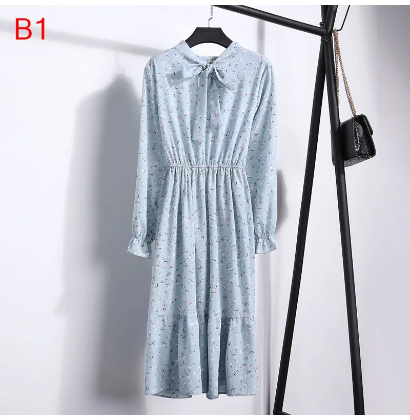 Женское повседневное осеннее платье, женское винтажное шифоновое платье-рубашка в Корейском стиле с цветочным принтом, летнее платье миди с длинным рукавом и бантом, платье
