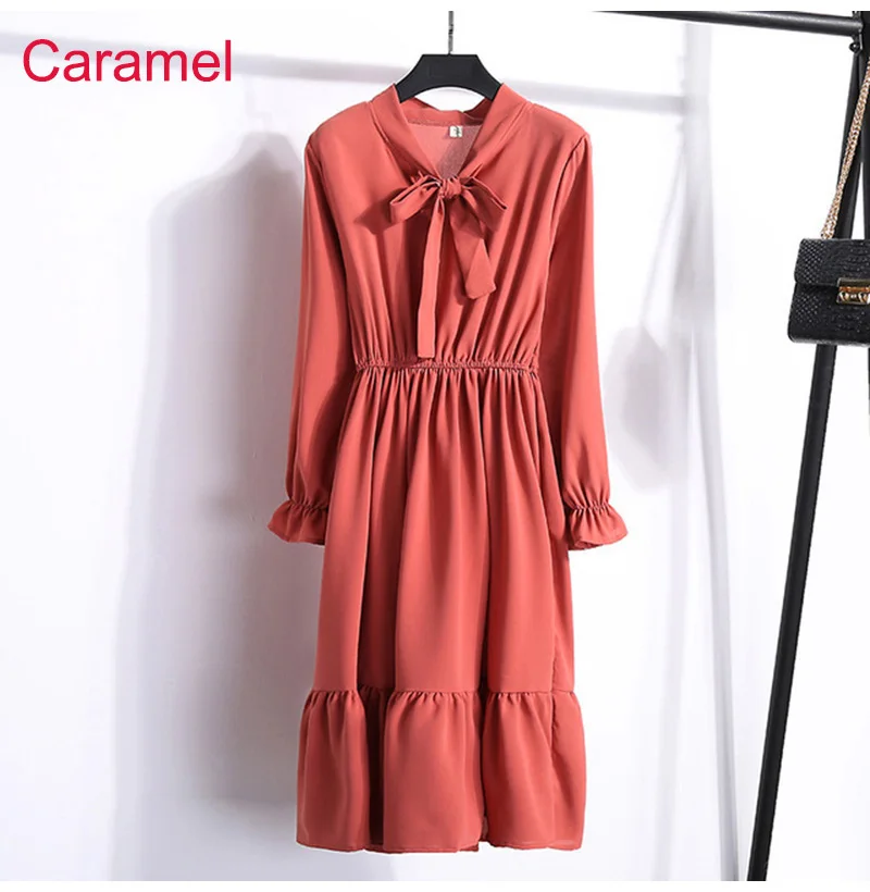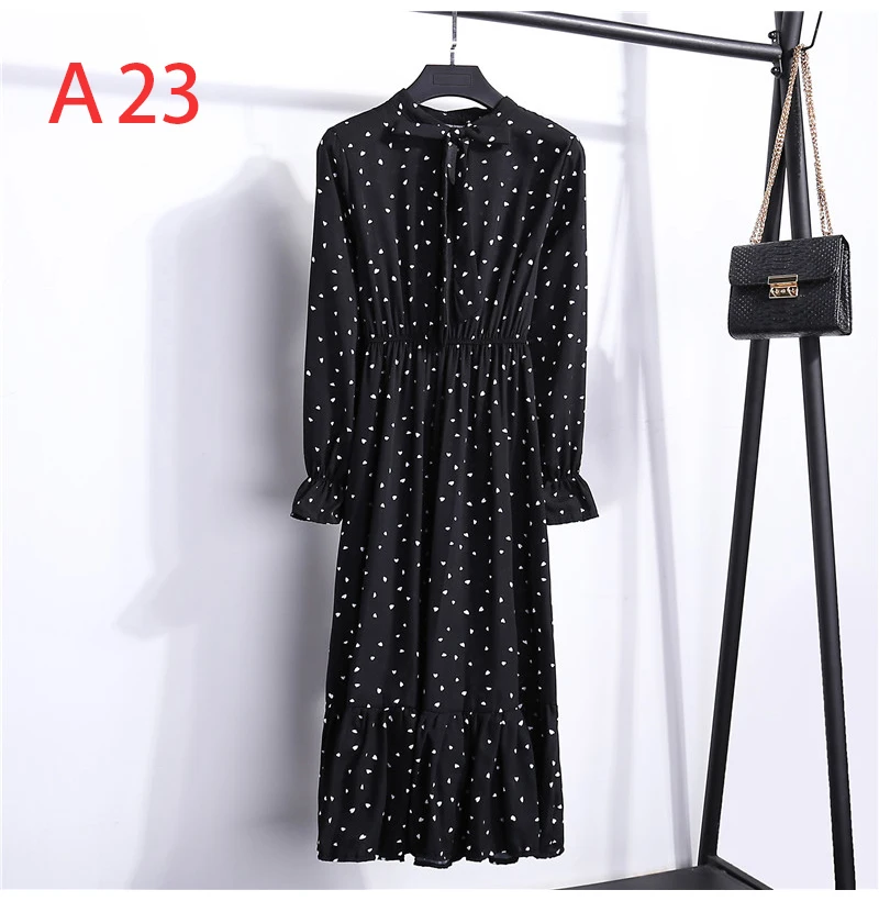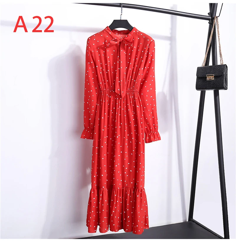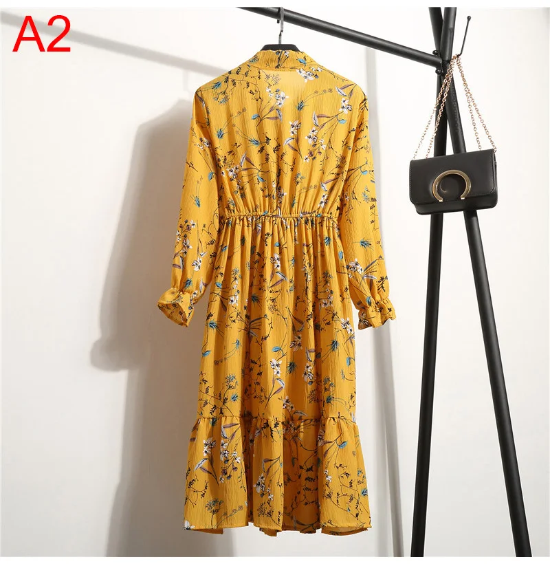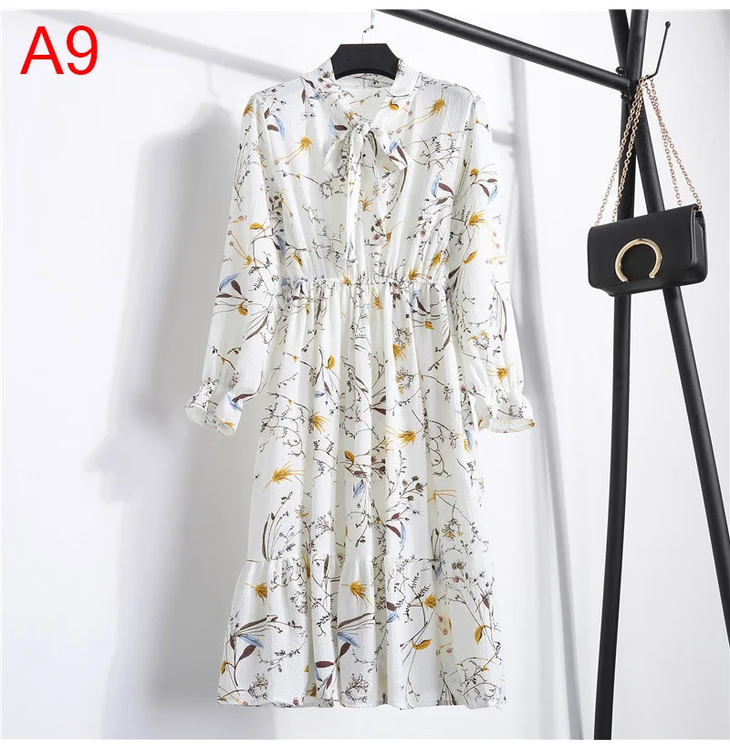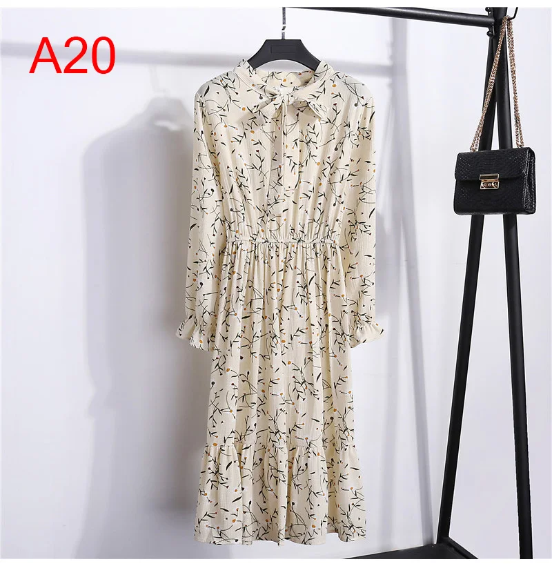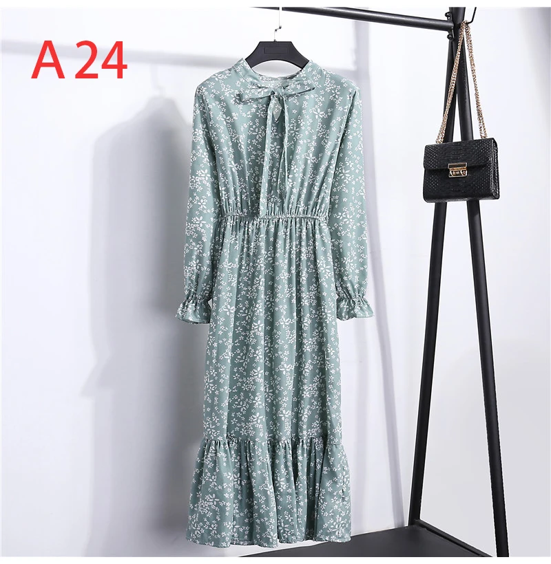Женское повседневное осеннее платье, женское винтажное шифоновое платье-рубашка в Корейском стиле с цветочным принтом, летнее платье миди с длинным рукавом и бантом, платье