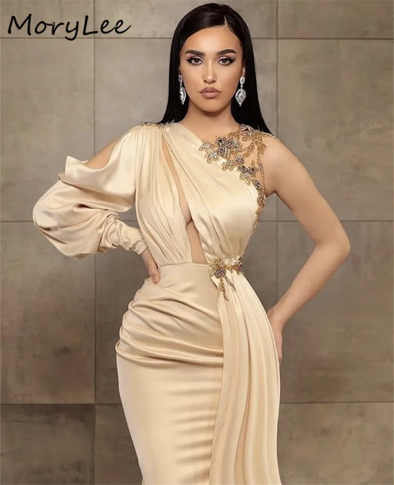 Вечернее платье с длинным шлейфом, одним рукавом, с длинными рукава...