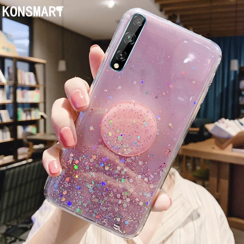 Прозрачный мягкий чехол KONSMART с блестками для телефона Huawei Y8P 2020, новый роскошный силиконовый чехол с блестящими звездами и держателем Y8P, чехлы