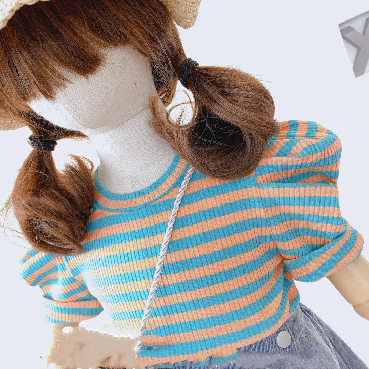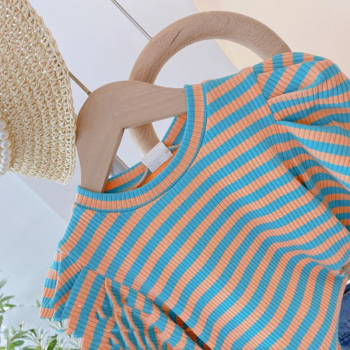 Летние комплекты одежды для девочек, топ в полоску с пышными рукава...