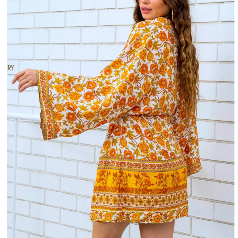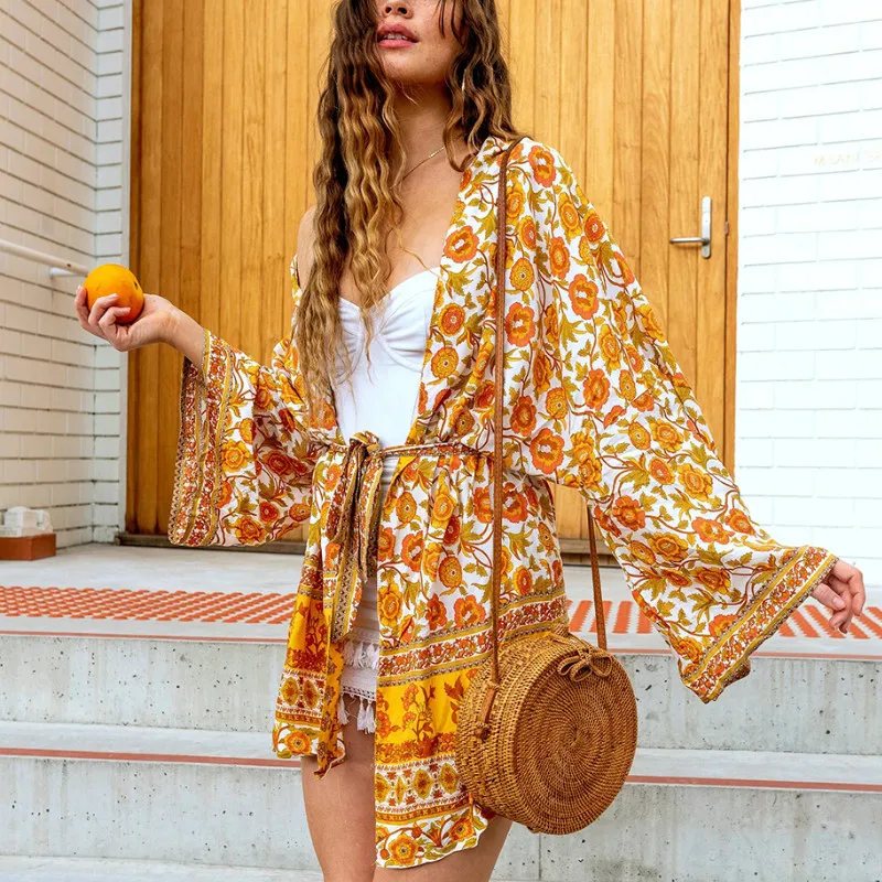 Женская накидка для плавания в стиле бохо, желтый кардиган с цветочным принтом, Пляжная блузка с рукавами-кимоно, халат-блуза