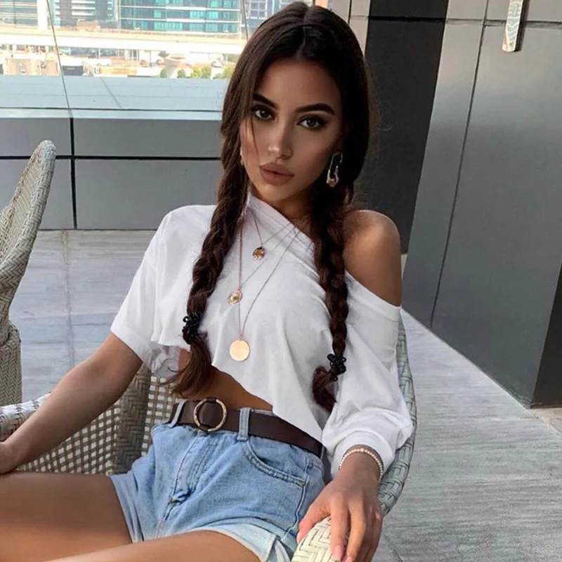 Женские повседневные футболки Fitshinling, однотонные облегающие белые базовые Короткие топы, футболки 2020, сексуальные женские футболки с коротким рукавом, топы