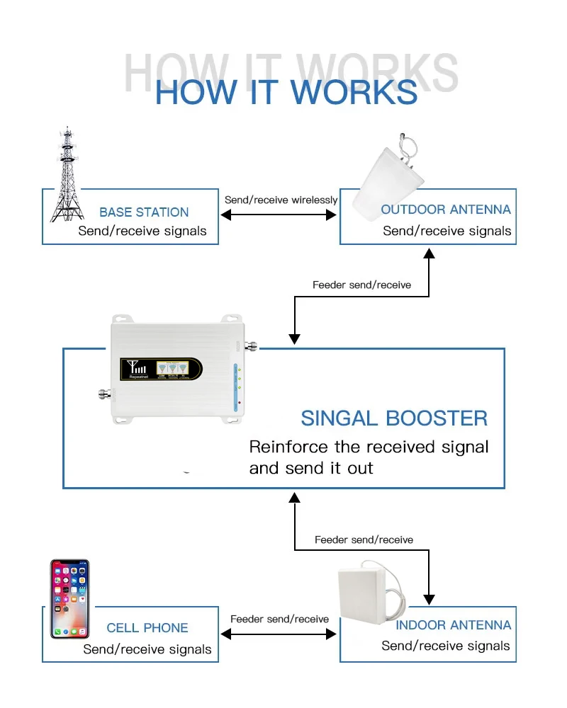 1. Получает сигнал Мощная антенна вытягивается для доступа к хорошему сигналу и передает его на усилитель. 2. Усиливает сигнал Усилитель получает сигнал, усиливает его и служит ретранслятором между вашим телефоном и ближайшей вышкой сотовой связи. 3. Широковещательный сигнал Ваши устройства получают повышенный прием ячеек, а звонки и данные передаются через усилитель обратно в сеть. Примечание: Пожалуйста, убедитесь, что вы собираетесь установить WCDMA 3G. И перед покупкой убедитесь, что у вас снаружи есть как минимум 2 полосы сигнала 3G, иначе этот продукт вам не поможет. Ему нужен хороший сигнал на улице, чтобы улучшить сигнал в помещении.