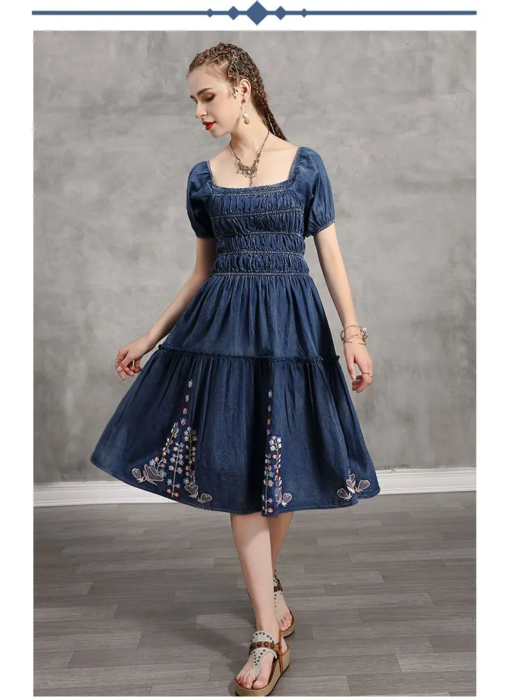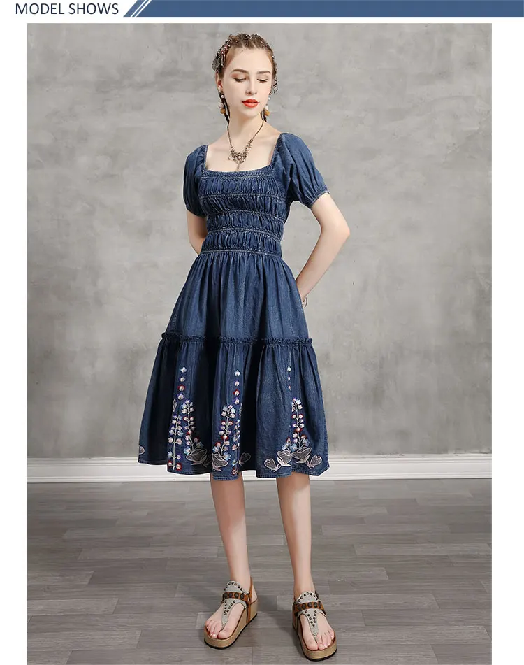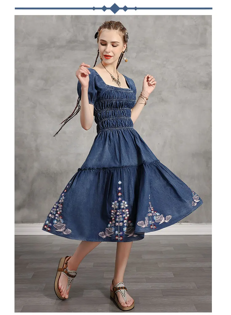 Летнее платье Yuzi.may бохо, новые женские джинсовые платья, с квадратным вырезом, коротким рукавом, винтажная эластичная вышивка, A82237