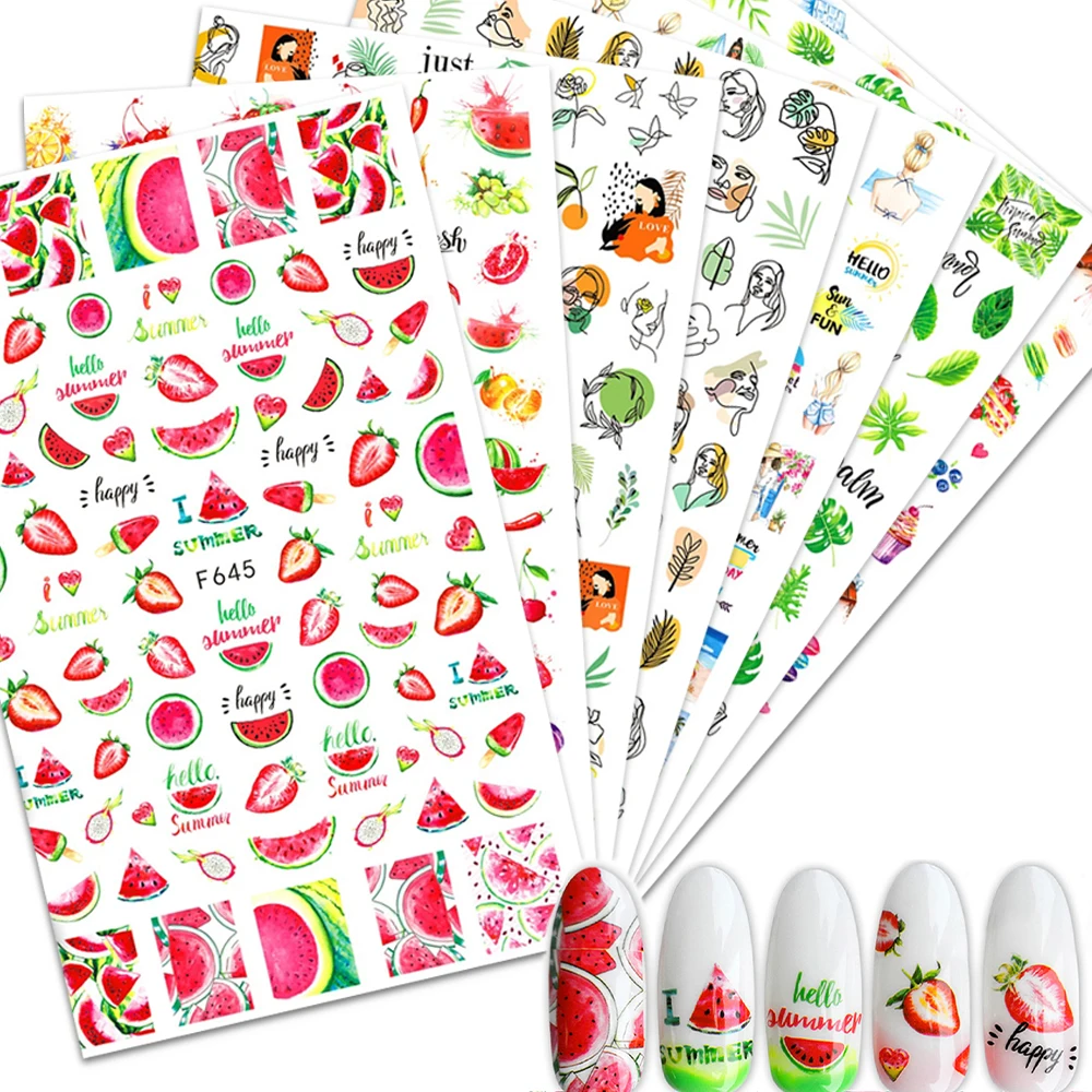 Клейкие 3D Слайдеры для ногтей, летние наклейки для ногтей с фруктами, листьями, арбузом, лимон, клубника, аксессуары для маникюра