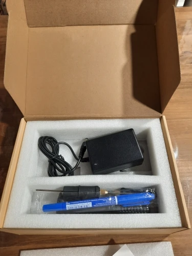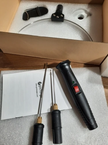 Пришло. Комплект соответствует описанию (3- сменные насадки, запасная нагревательная проволока, подставочка и плюсом - маркер). Работоспособность еще не проверял.