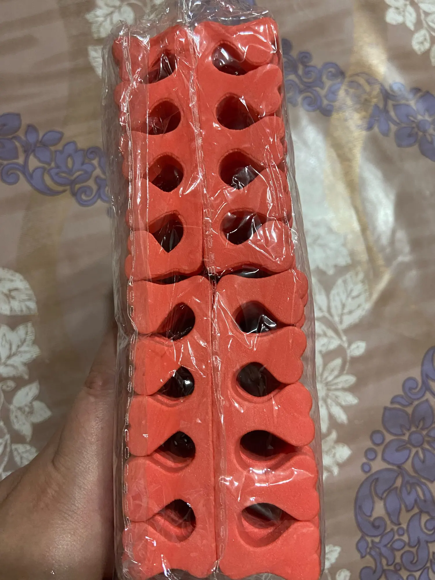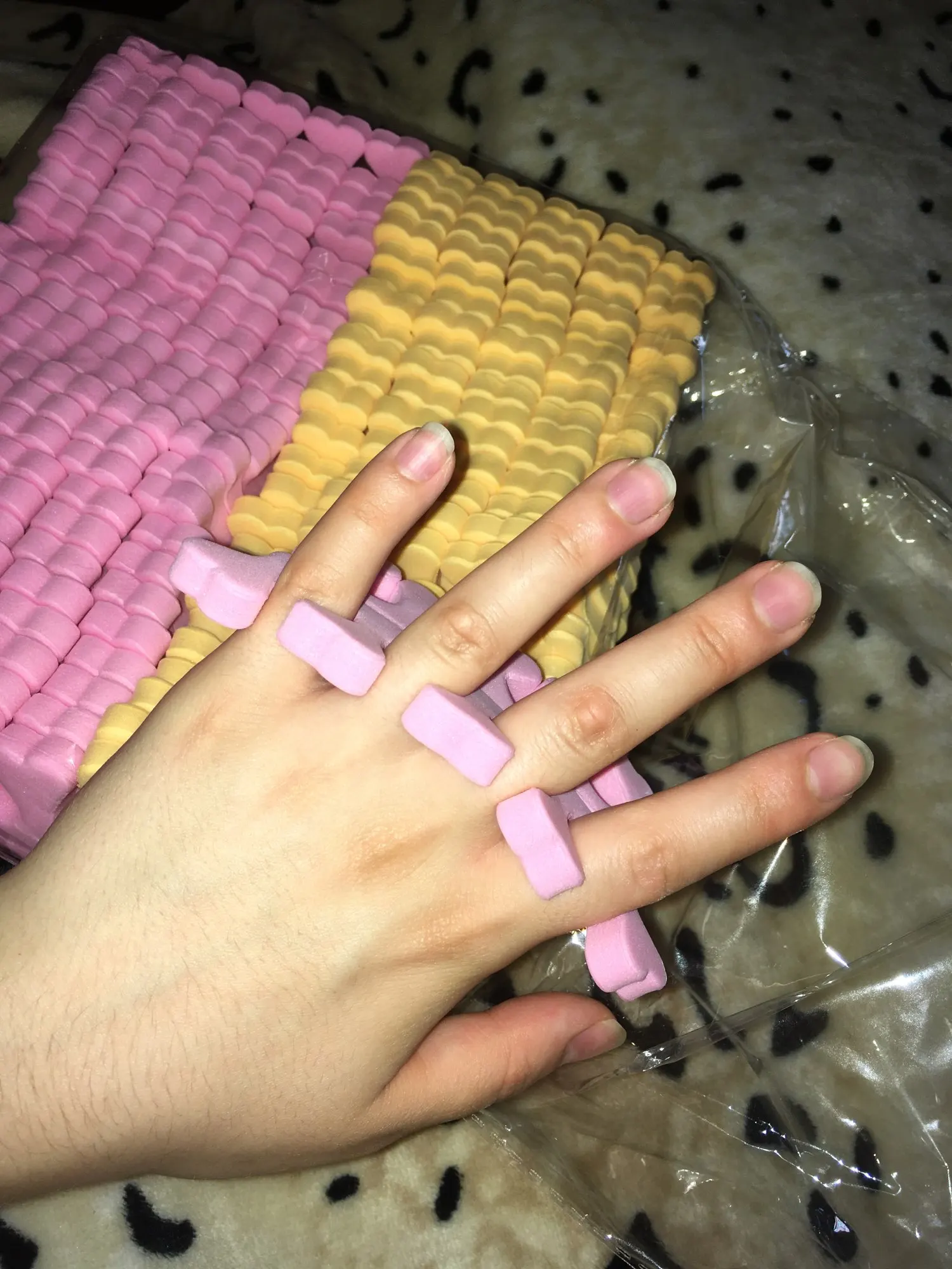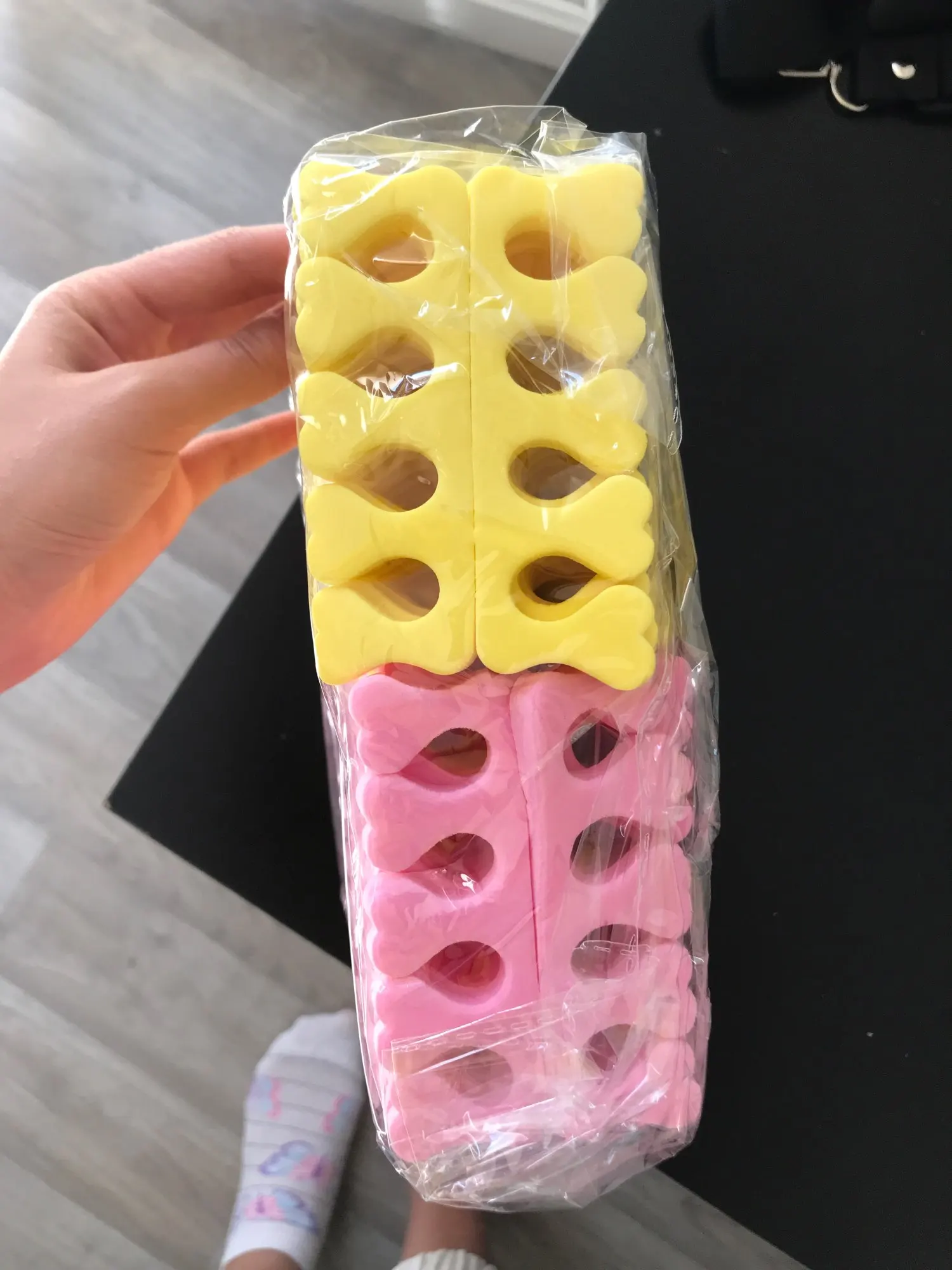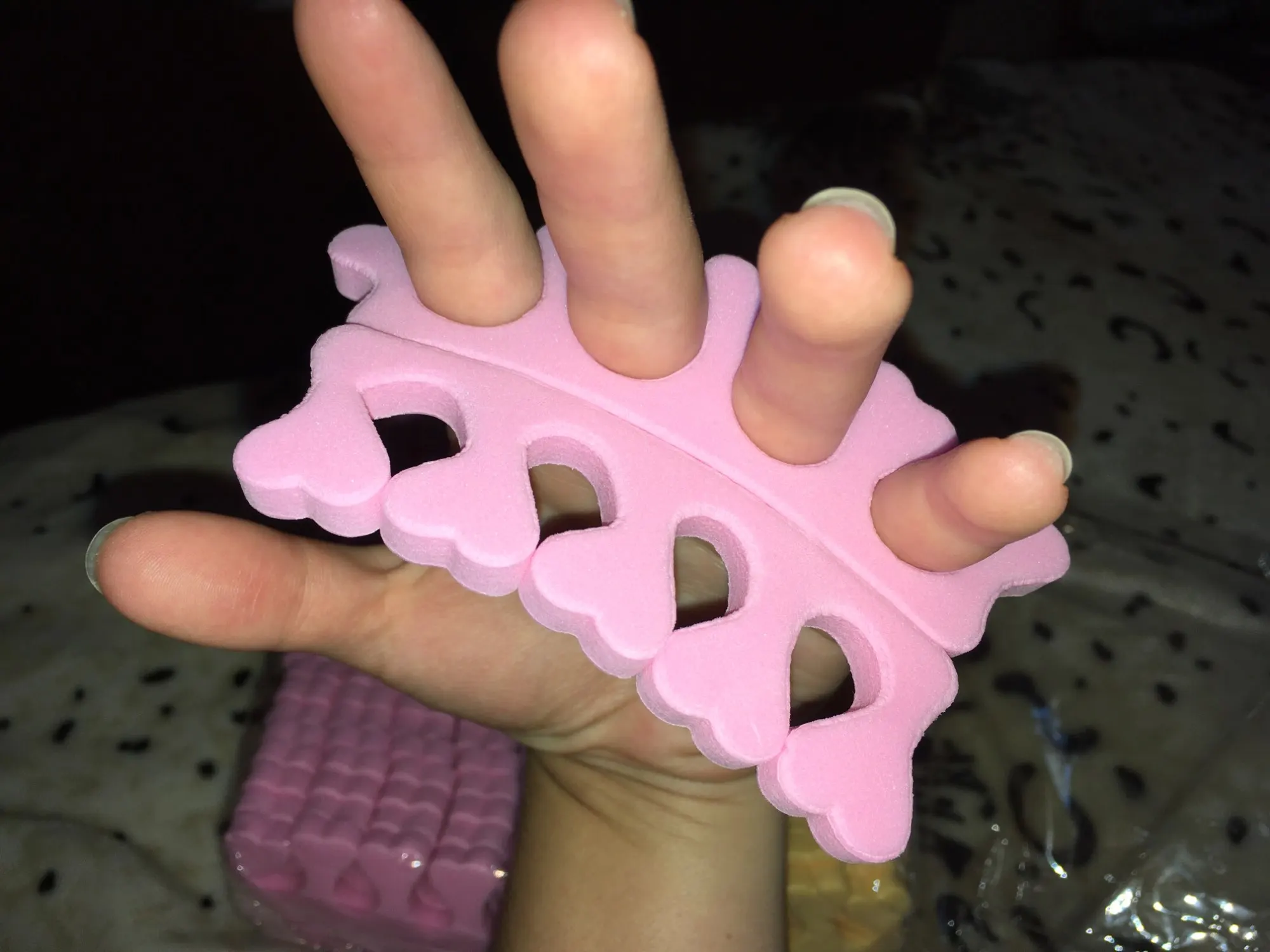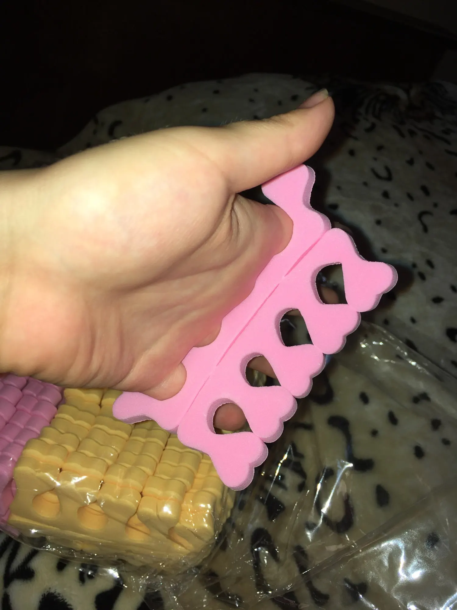 Неплохие разделители для пальцев, пришли двух цветов. Качество среднее; для рук подходят, а педикюр будет не так просто делать, ведь все разделители одного размера, а пальцы у всех разные. По крайней мере их много за такую цену