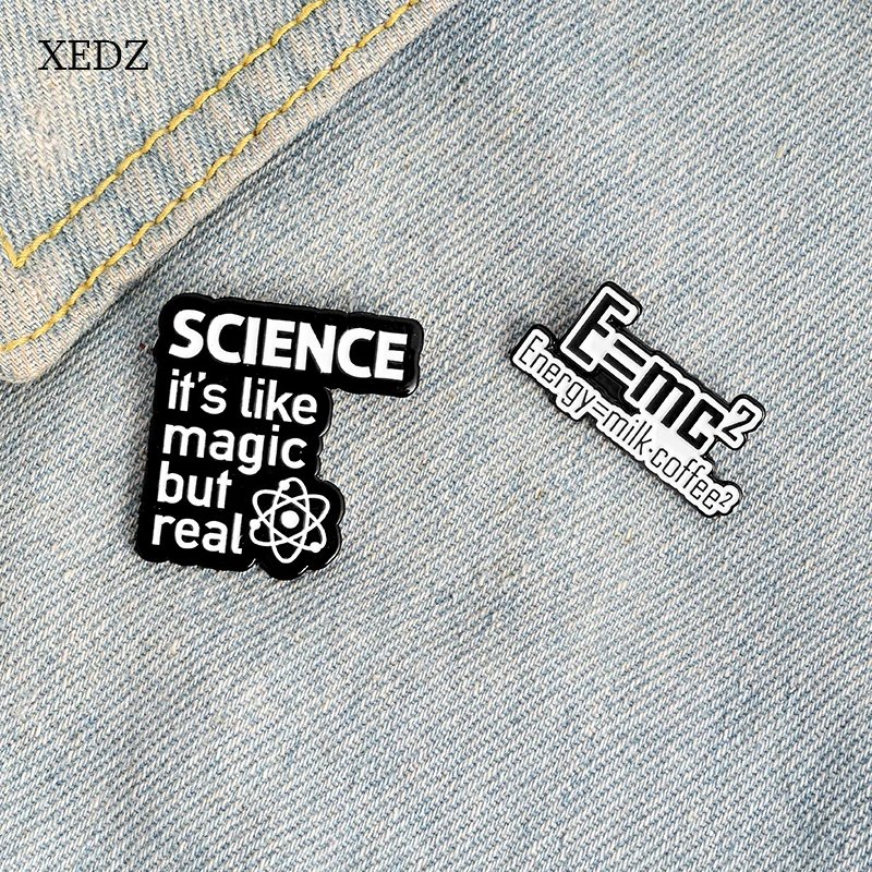 XEDZ черно-белый текст, наука похожа на магию, но очень реальнаяE = MC2 Энергия Кофе Эмаль Булавка Романтический значок панк одежда лацкан