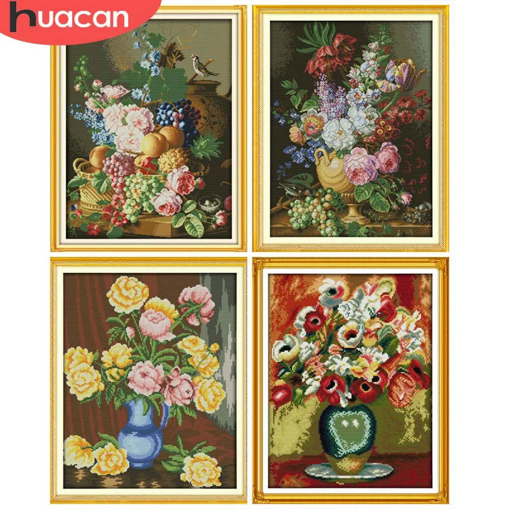HUACAN вышивка крестиком цветок в вазе наборы розы цветочные наборы...
