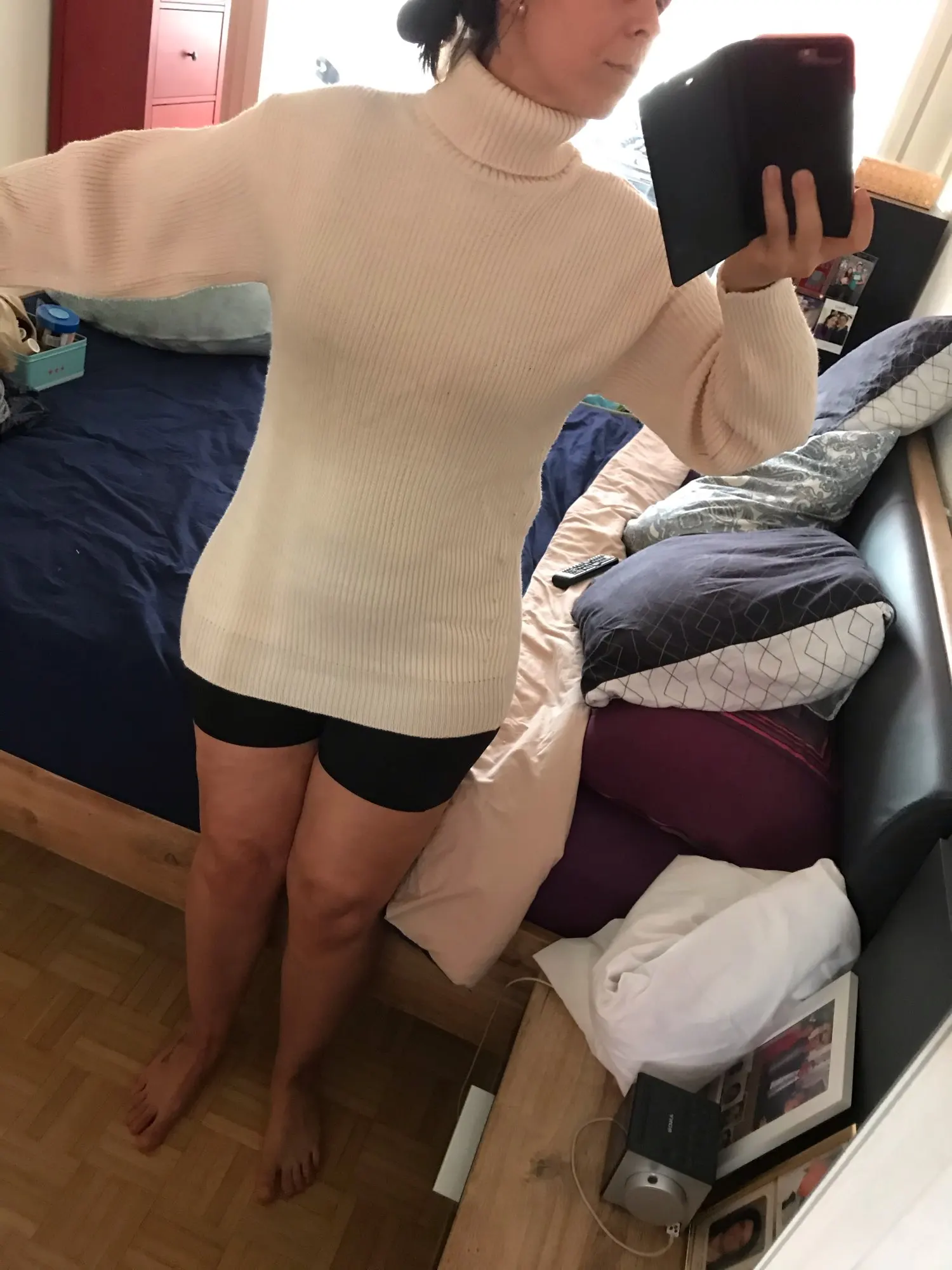 Он красивый и отличного качества. Плотная и приятная ткань. Он ничего не наносит. Цвет лососевый бежевый. Это не очень долго. Я 1,53 м и вес 46 кг, и он ниже моей задницы, впереди меня немного длиннее. Для кого-то высокого или длинного торса может быть коротким.