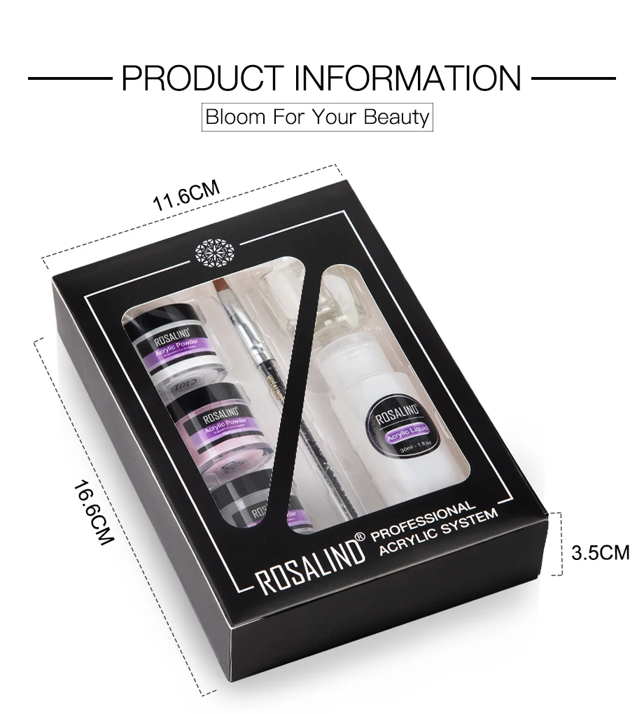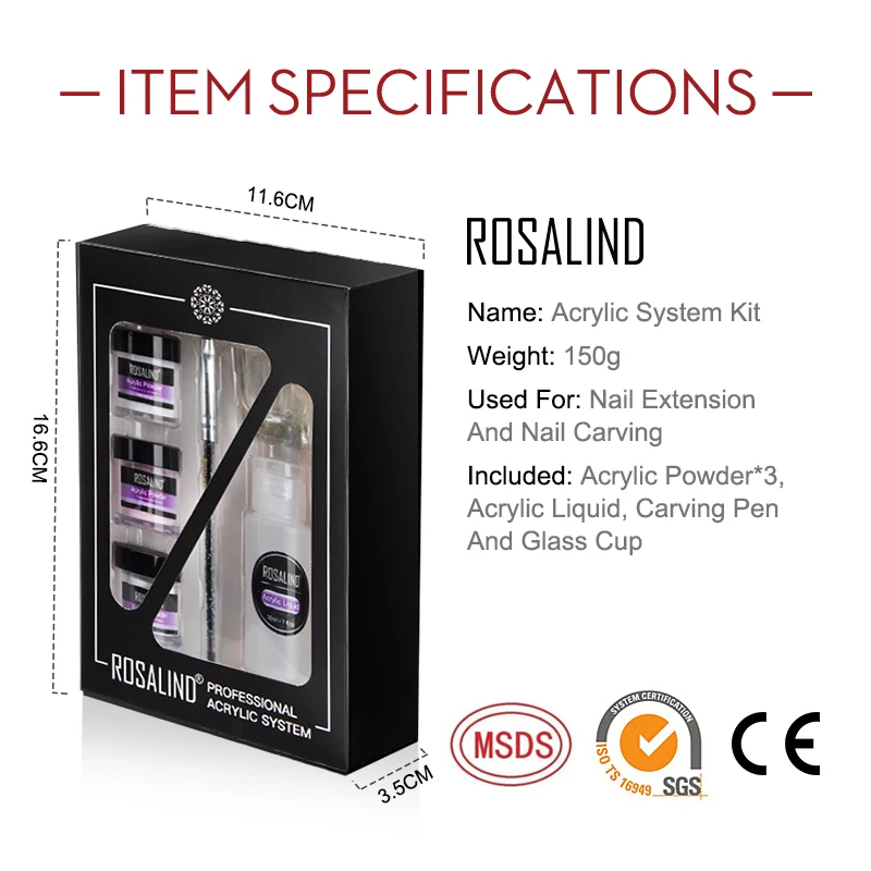 Бренд: ROSALIND Название: акриловый набор вес: 150 г используется для: наращивания ногтей и резьбы по ногтям в комплекте: акриловый порошок * 3, акриловая жидкость, ручка для резьбы и стеклянная чашка