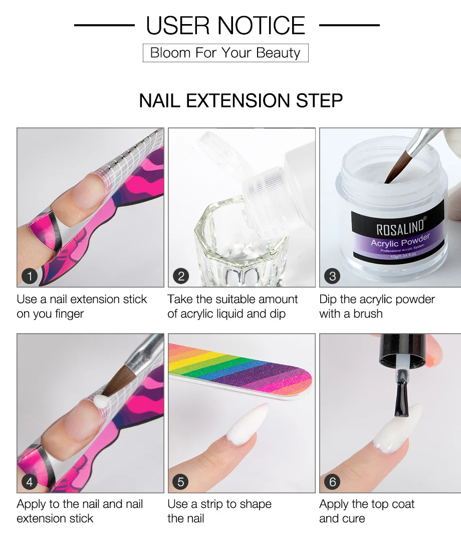 Шаг наращивания ногтей: 1. Нанесите Базовое покрытие, вылечите светодиодный/УФ-лампа. 2. Нанесите форму ногтя на ваш ноготь. 3. Возьмите достаточно акриловой жидкости для чашки. 4. Нанесите акриловый порошок акриловой жидкостью на гвоздь. 5. Нанесите его на ноготь. Подождите, пока он высохнет. 6. Снимите форму ногтя. 7. Обрежьте форму ваших ногтей. 8. Нанесите верхнее покрытие, вылечите светодиодный/УФ-лампой. 9. Отделка.