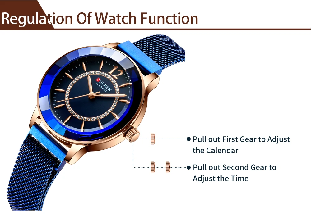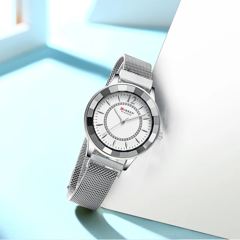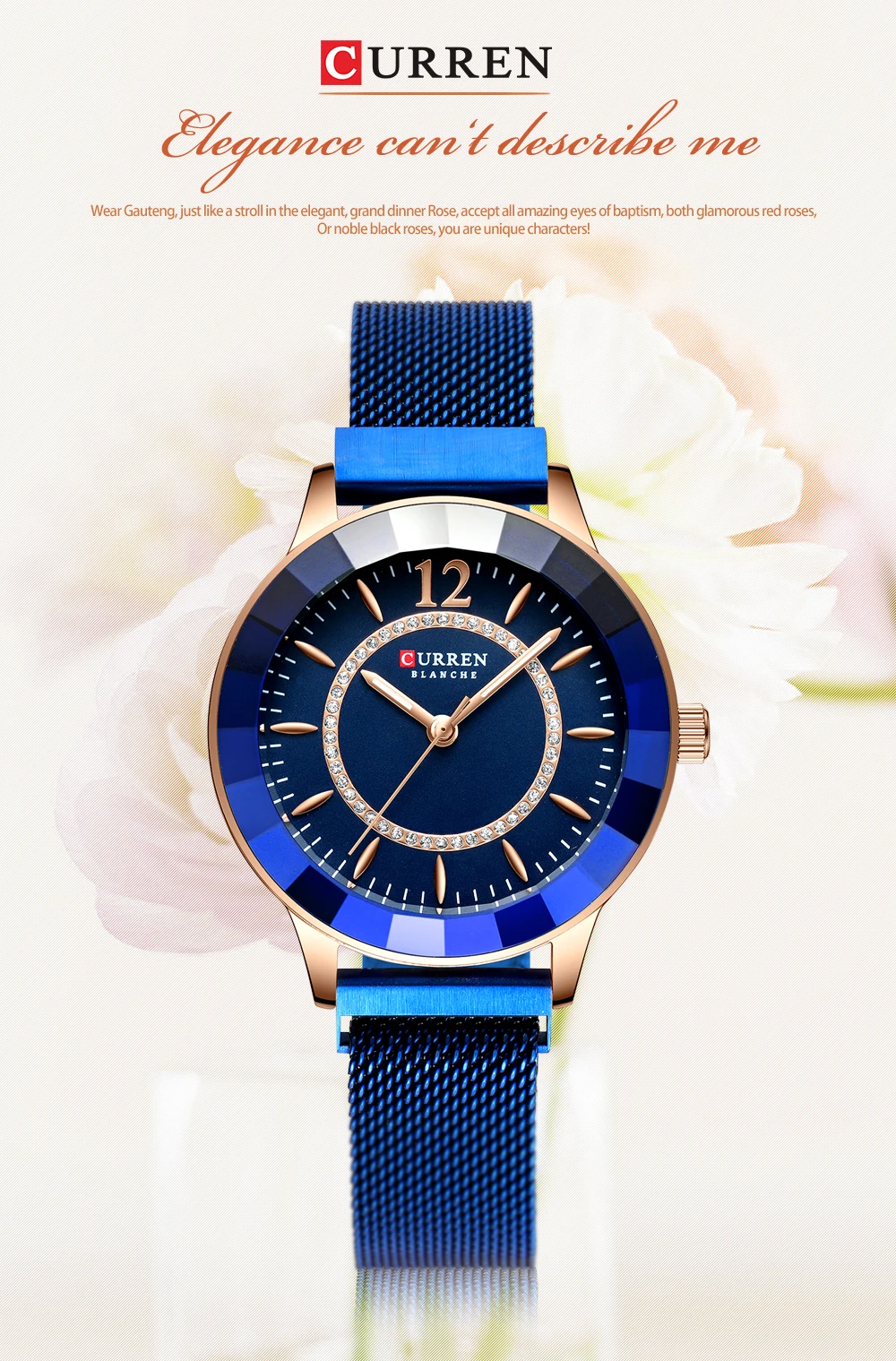 Модные Кварцевые часы Женские CURREN, новые синие женские часы с сетчатым браслетом, стразы, стильные роскошные часы