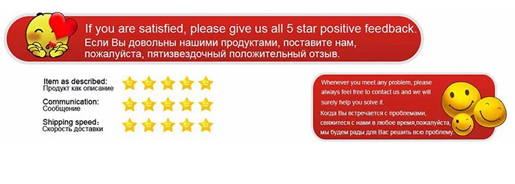 Ваши отзывы очень важны для нас. Пожалуйста, оставьте положительные отзывы и 5 звезд, если вы удовлетворены нашими товарами и услугами. Если вы не удовлетворены заказанными товарами, пожалуйста, свяжитесь с нами, прежде чем открыть спор или оставить отрицательный отзывы. Мы можем работать вместе, чтобы решить любые проблемы.