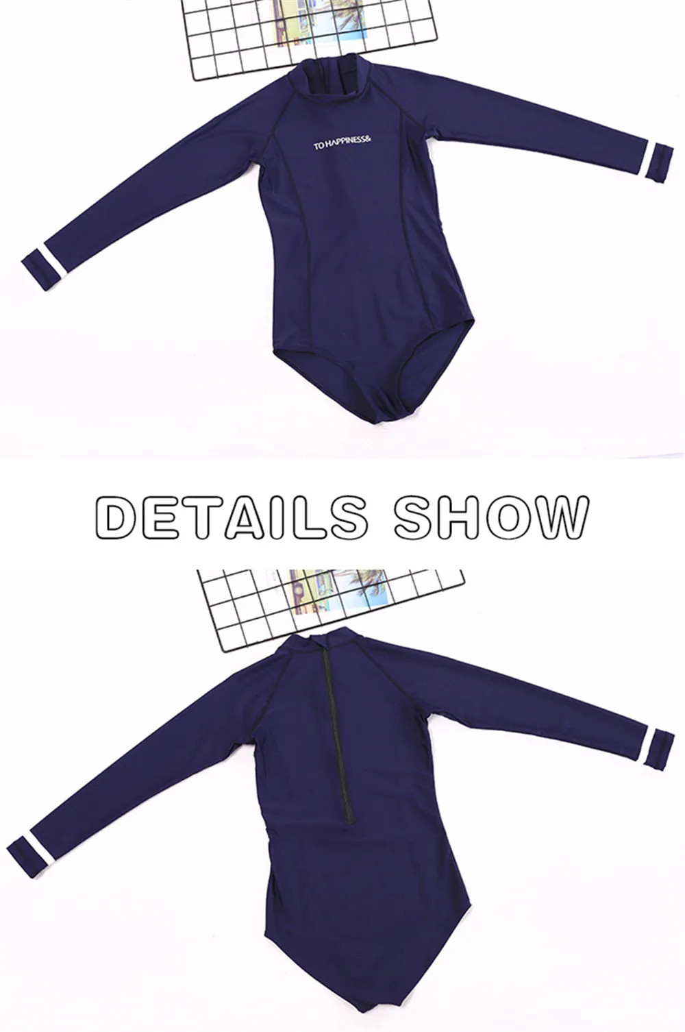 Женский Цельный купальник с длинным рукавом и принтом в виде букв, купальный костюм с высокой горловиной, синие костюмы для серфинга