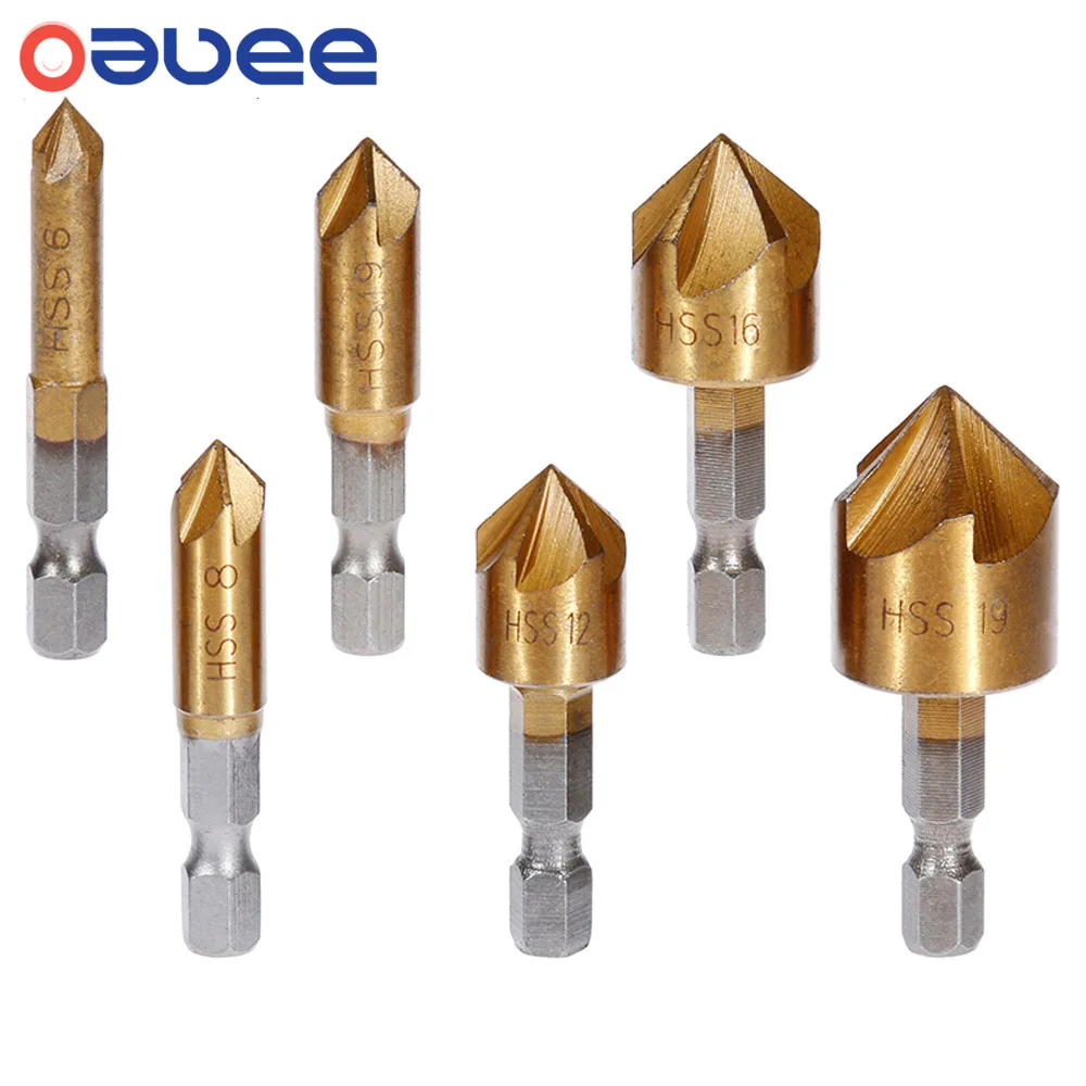 Набор зенкеров из быстрорежущей стали, 5 бороздок, 14 дюйма, шестигранный хвостовик, 90 градусов, для снятия фаски, 6-19 мм