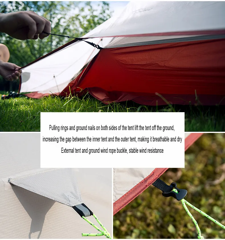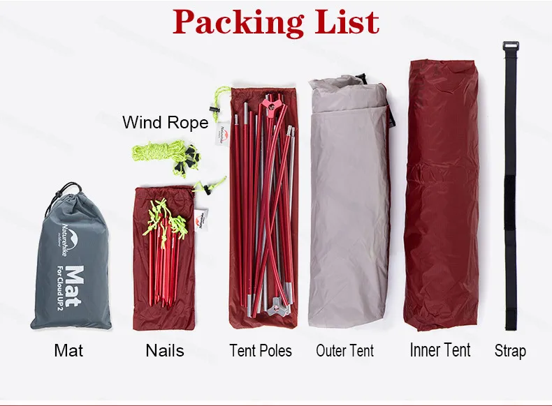 Аксессуары: наземные гвозди + шатры + Внешняя палатка + Внутренняя палатка + ремень + коврик + ветряная веревка