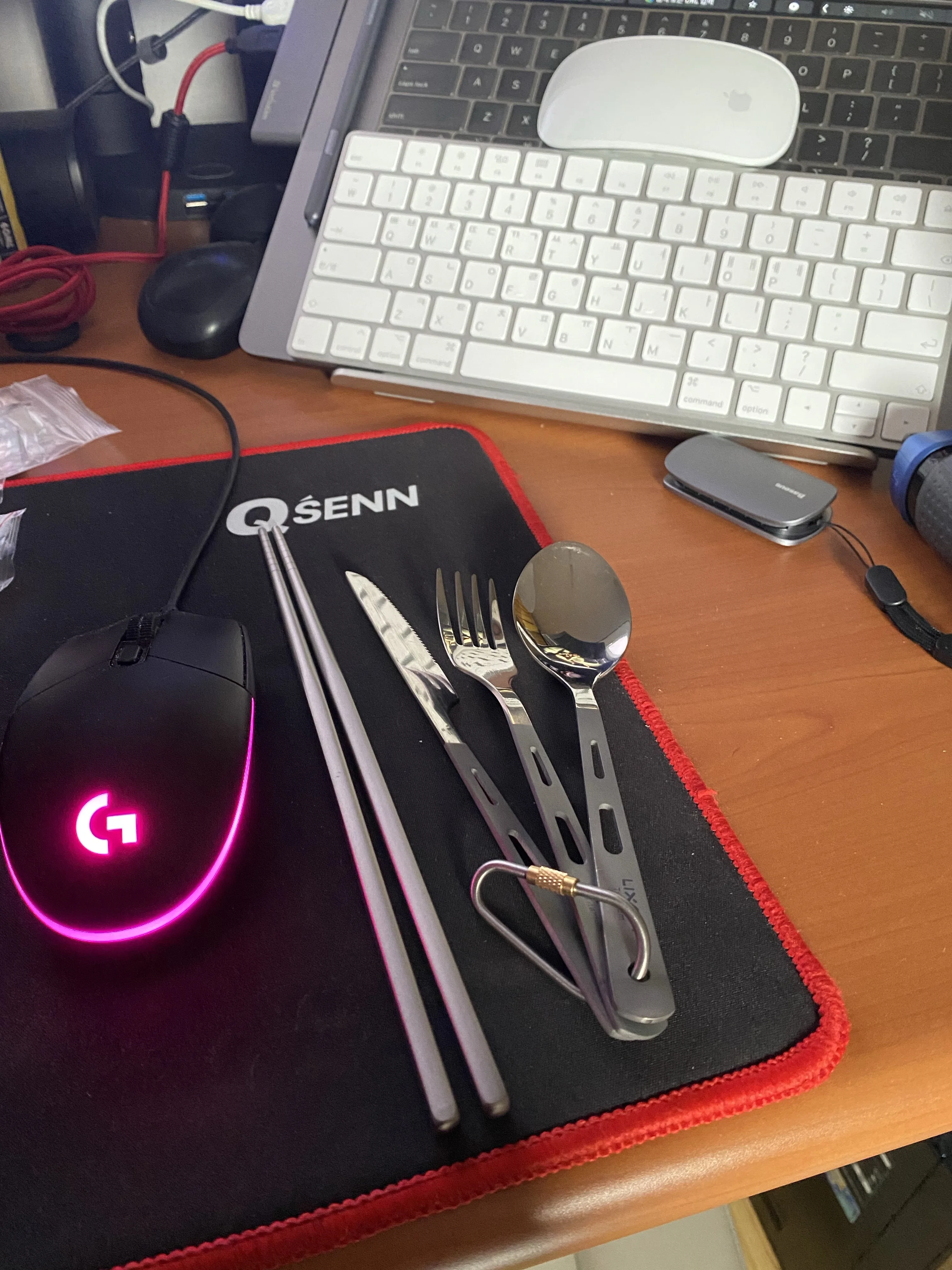 В комплекте идет карабин, чтобы держать вилку, ложку, резак вместе.