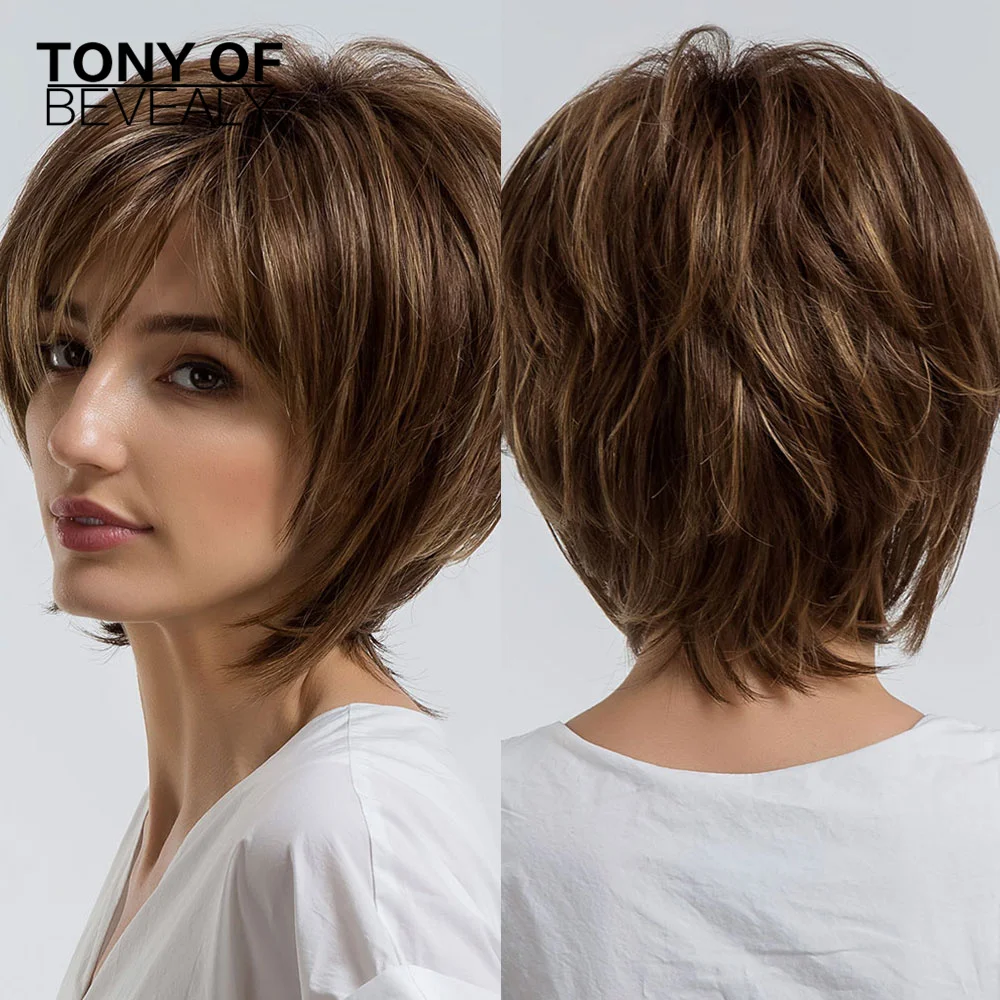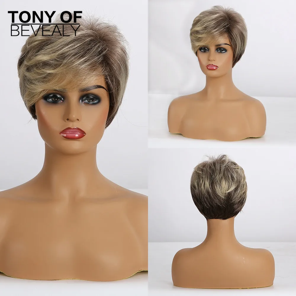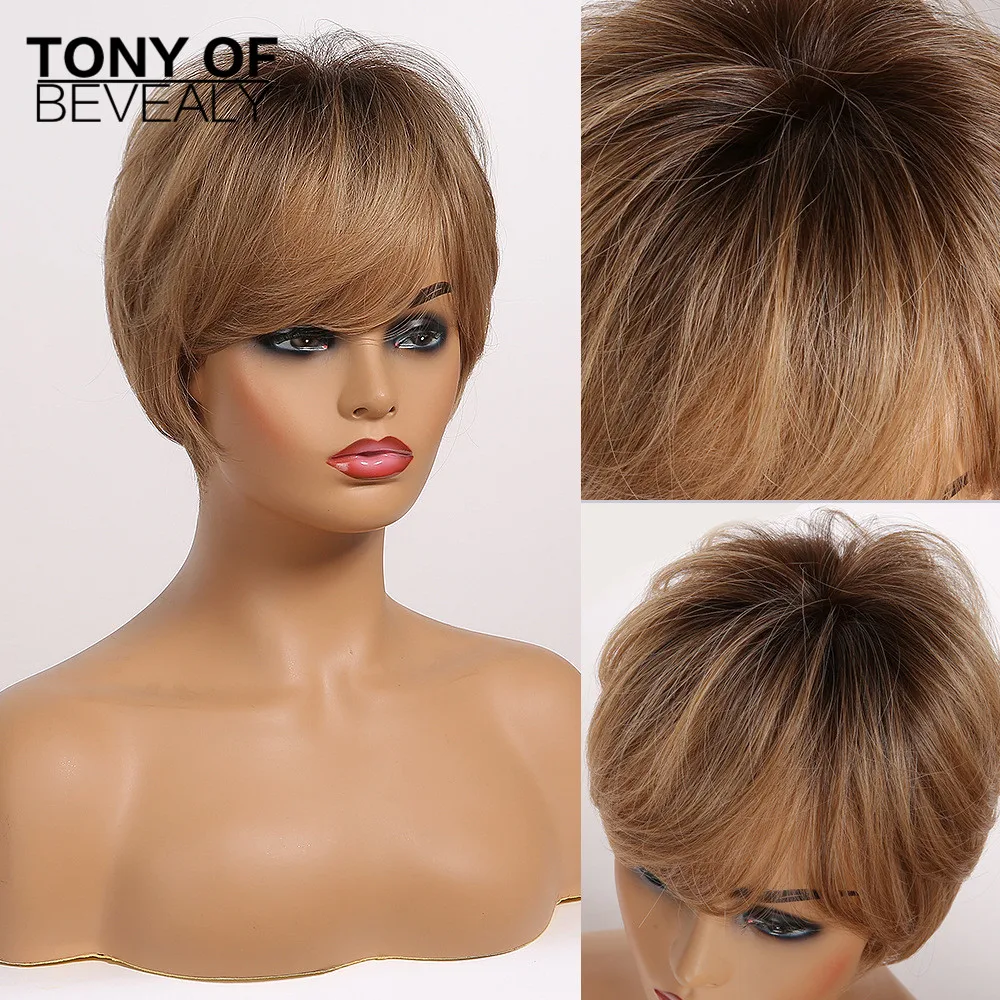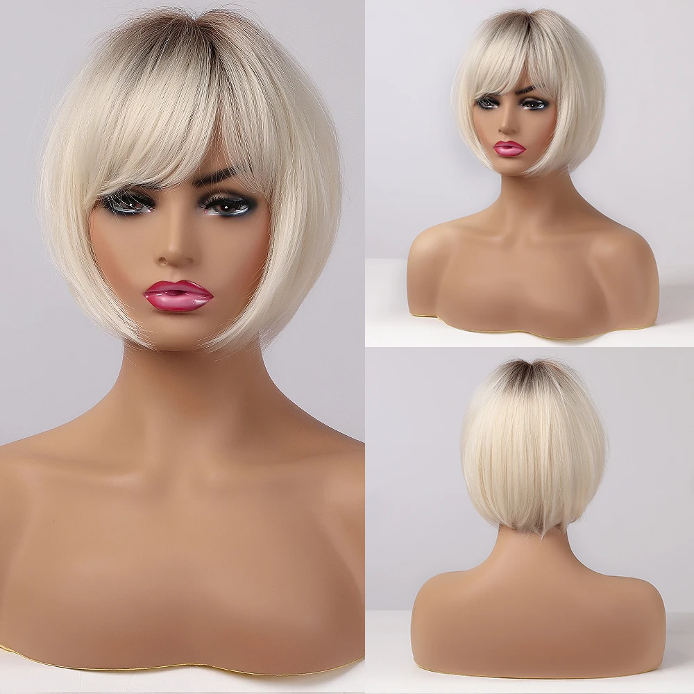 Короткие прямые парики с эффектом омбре, коричневые синтетические парики с челкой для чернокожих женщин, термостойкие парики из натуральных волос для ежедневного Косплея