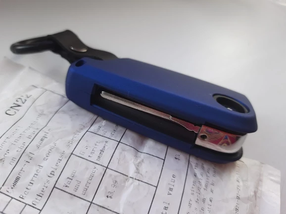 Erg blij mee, netjes verpakt in noppenfolie, kleine schroevendraaier zit erbij, zelfs een schroefje extra. Je sleutel wordt er wel een stuk dikker/groter van, maar het biedt wel optimale bescherming.