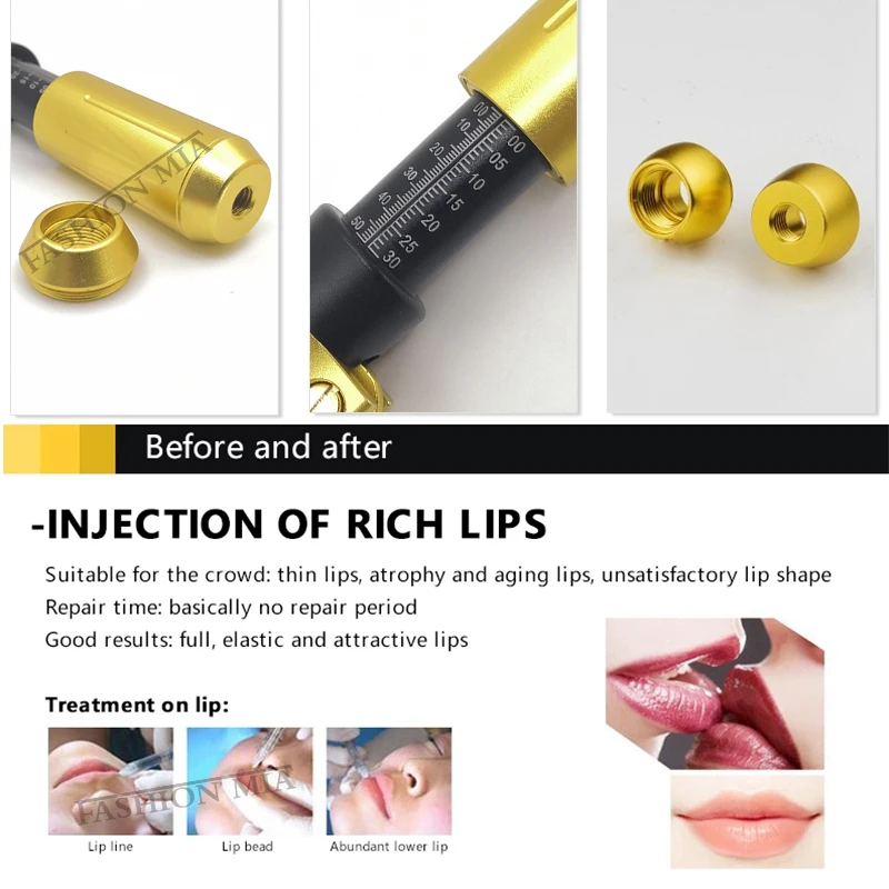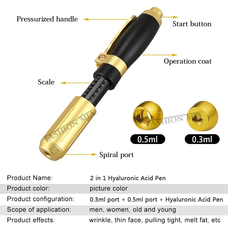 Спецификация: Тип изделия: 2 в 1 гиалуроновая ручка Цвет: черный, золотой Материал: нержавеющая сталь Количество Одиночная впрыска: 0,05-0,5 мл (5-50IU) Время использования: 2000 раз Глубина впрыска: 4-6 мм Размеры: 0,3 мл и 0,5 мл Объем: 0,01 мл ~ 0,12 мл (минимальный масштаб 1 рамка 0,01 мл, в том случае, если вы хотите, чтобы играть в 0,05, затем вниз 5 кадров, максимум 12 кадров-0,12 мл, самый большой масштаб 0,5 мл) Характеристика: 1. Без иглы: У многих людей игольчатая фобия. Наша технология без игл облегчает игольную фобию без игл. 2. Практически без боли: Быстрая инъекция менее 1/3 секунды, микро отверстие и автоматическое пружинное давление делают инъекции с «серой» практически безболезненными 3. Быстро, легко и безопасно: Он может быть использован пациентами для самостоятельной инъекции, или другие лица могут вводить инъекции назначенного лекарства. 4. Нет риска травм игольчатой палки: Он устраняет повреждения игольчатой палки, так же как и без игл, тем самым снижая затраты на удаление, устраняет перекрестное загрязнение 5. Сопло и адаптер стерилизуются гамма-облучением: Они одноразовые, что исключает возможность перекрестного загрязнения. 6. Длительный срок службы и низкое техническое обслуживание: Используется для более чем 10000 инъекций, и Он управляется самоприводной пружиной.