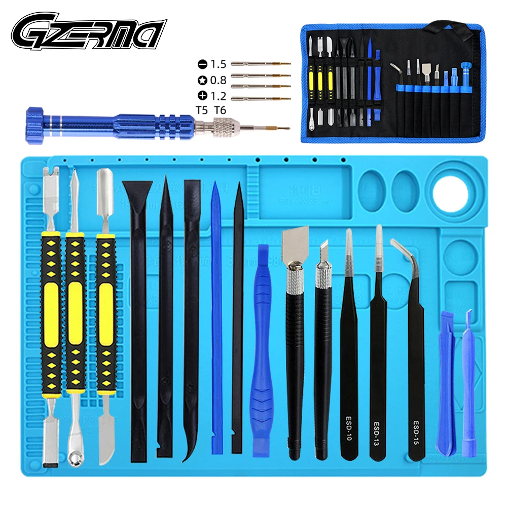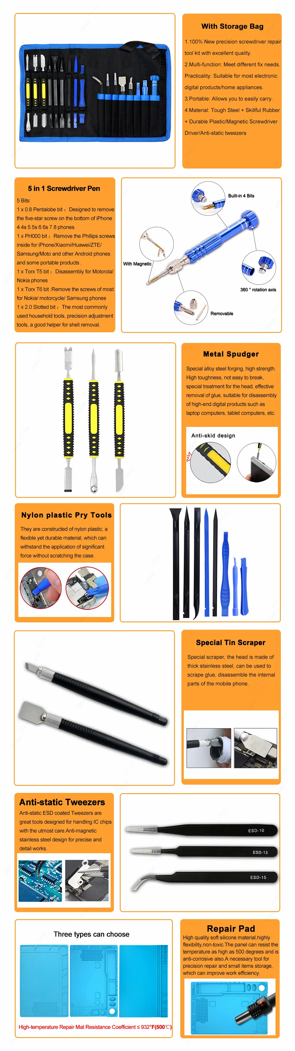 [Особенности]-Набор инструментов для разборки и открывания профессиональной отвертки.-Прост в использовании и обращении.-Отвертки с противоскользящей ручкой и магнитными наконечниками.-Изготовлен из высококачественного материала, прочный и Высокоточный.-Профессиональные ремонтные инструменты нацелены на помощь во время ремонта устройств.-Идеально подходит для сохранения и поддержания точной работы и оптических средств, таких как точные часы, мобильные телефоны, телевизоры, смартфон, КПК, ПК и другие приложения.Инструменты разных размеров для всех нужд.-В рознипосылка вке, отлично подходит для перепродажи или для вашего магазина[Содержание набора инструмента】Искусственная Магнитная отвертка с 5 битами:1 x ручка отвертки1x0,8 бит Pentalobe1 x PH000 бит1 x бита Torx T51 x бита Torx T61x2,0 шлицевое сверлоИскусственный Антистатический пинцет x 3 шт.Искусственная металлическая лопатка с двумя концами x 3 шт.Искусственная нейлоновая Антистатическая лопатка x 8 шт.Ходовой стержень BGA размешиваемый припой шпатель для пасты x 2 шт.Искусственная теплоизоляционная Силиконовая накладка x 1 шт.[В комплект входит]:Пожалуйста, проверьте опцию!