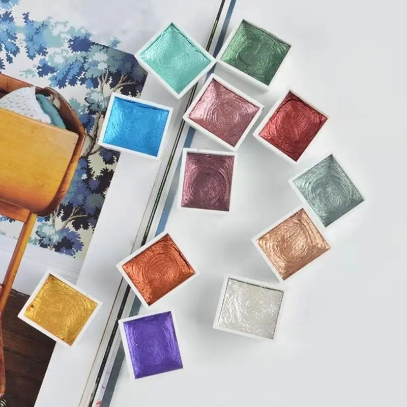 Набор блестящих акварельных красок ручной работы, 12 цветов, цвет металлик, золото, акварела, пигментная краска, художественная краска