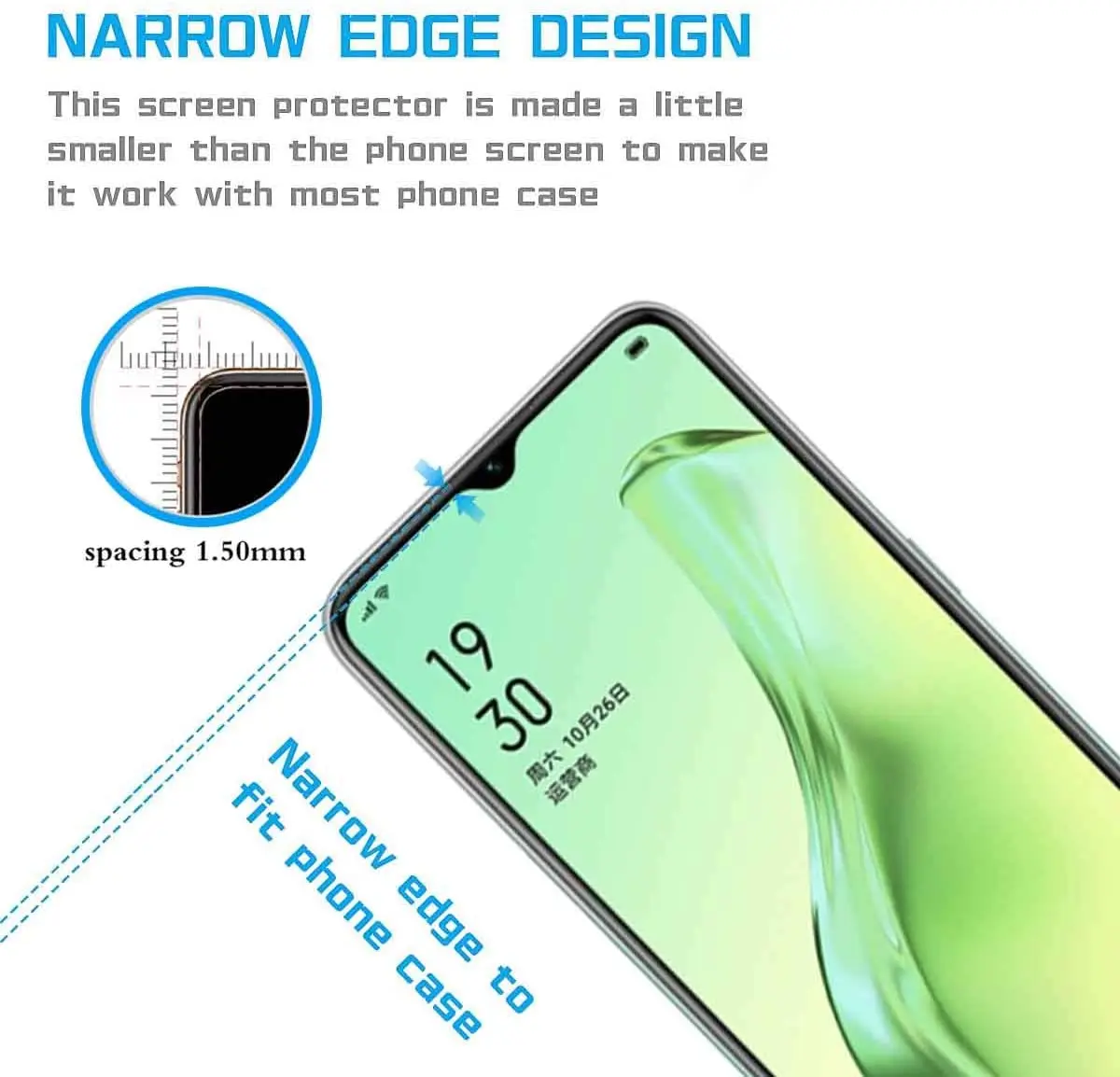 Дизайн меньше, чем экран телефона по краям, закрывает только плоскую область дисплея, чтобы соответствовать всем чехлам.