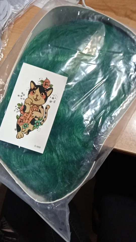 парик хороший, немного длиннее, чем на фото, пришел с шапочкой и переводными тату, немного неровный, но в целом покупкой доволен