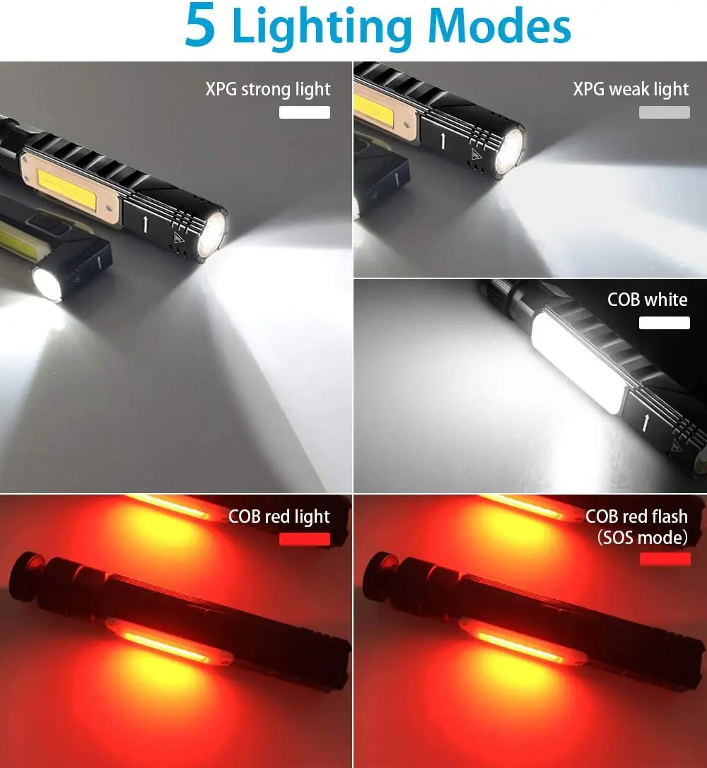 [Сильный магнит и боковой светильник COB]: мощный магнит в задней части вспышки светильник позволяет подключить этот светодиодный светильник к любой железной поверхности, чтобы освободить руки. Боковые фары COB могут использоваться в качестве технического обслуживания, рабочих огней или домашних аварийных резервных огней. Подходящий магнит-идеальное сочетание.