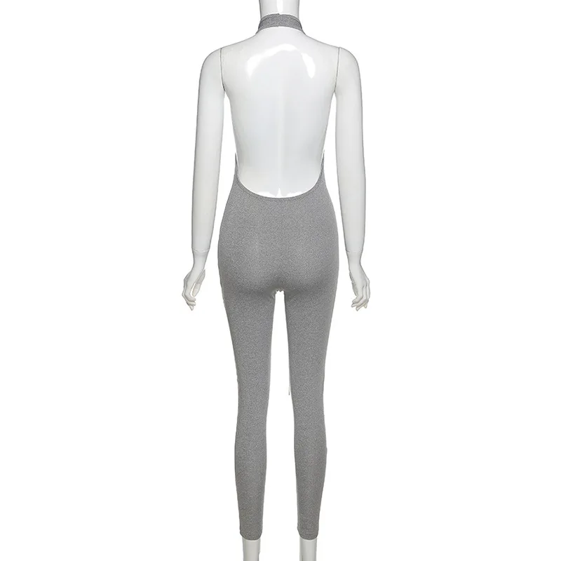 Сексуальный женский комбинезон с глубоким V-образным вырезом и открытой спиной, ярлык на удачу, леггинсы, облегающий черный, серый комбинезон, женский летний 2020