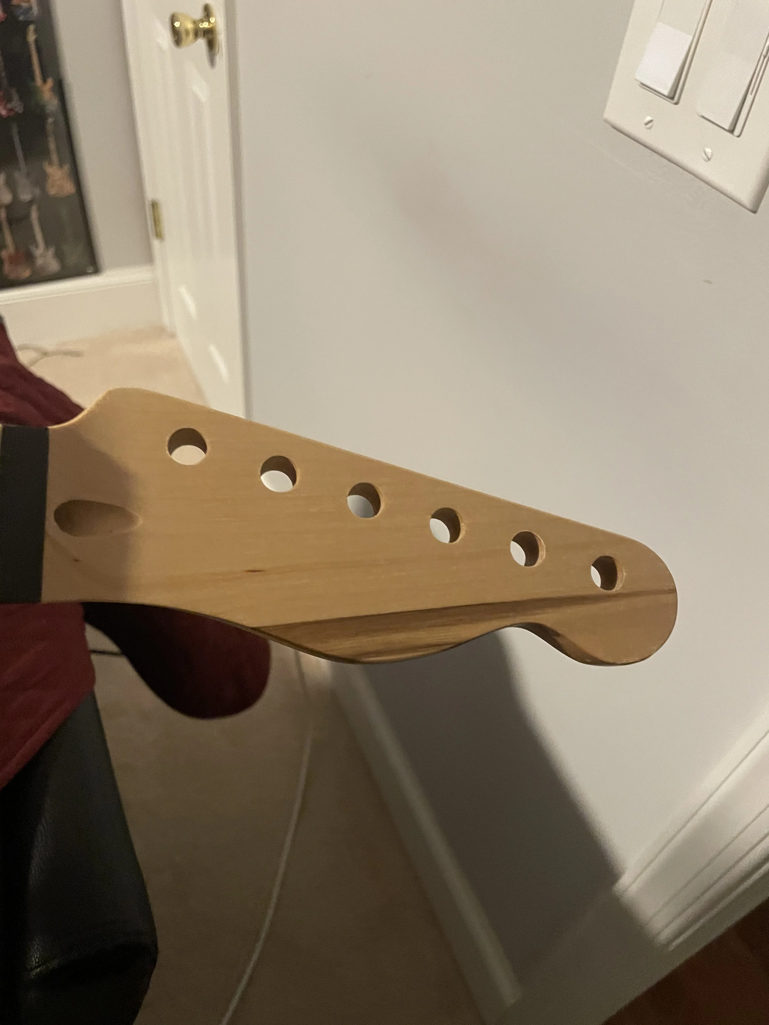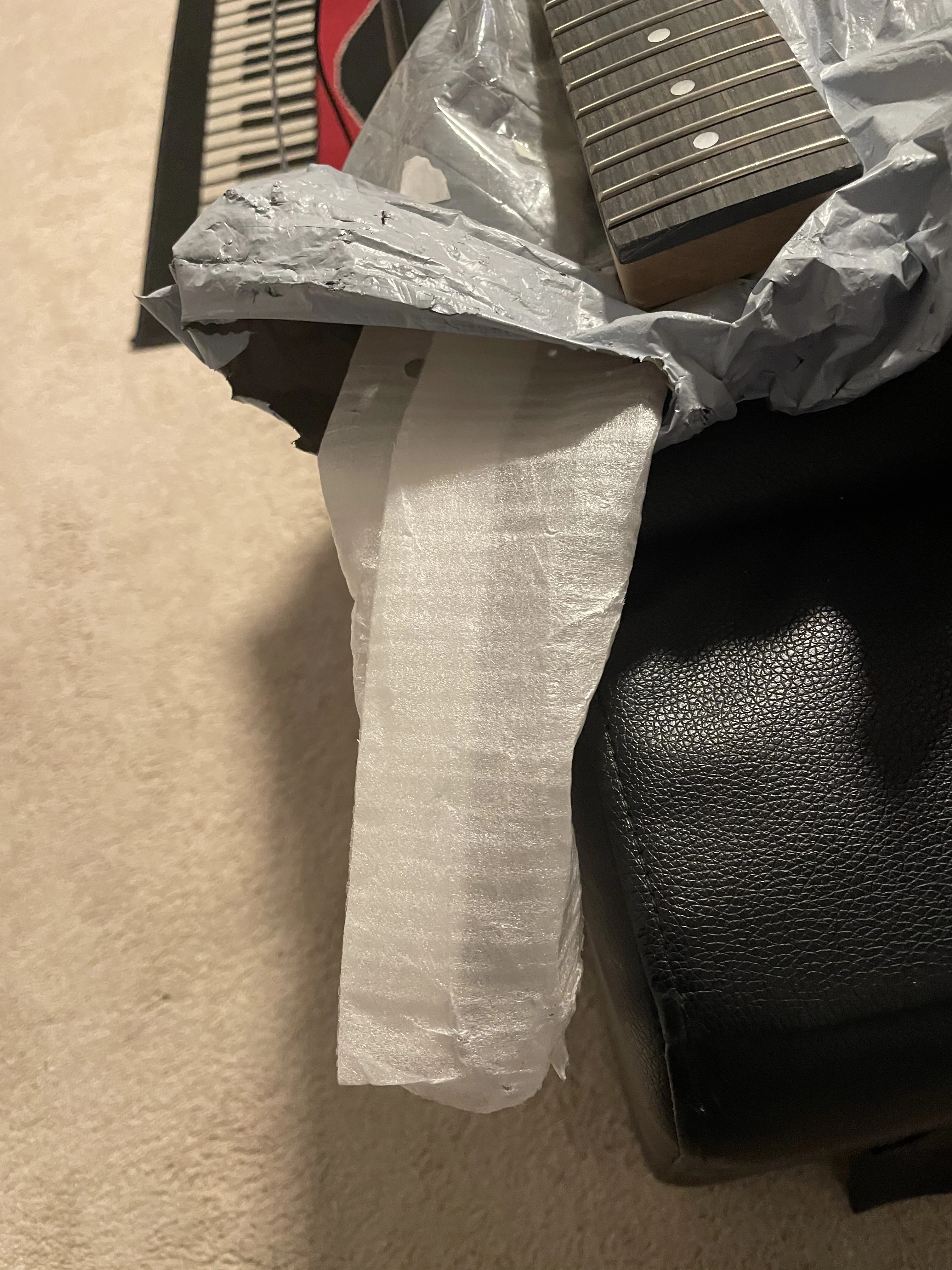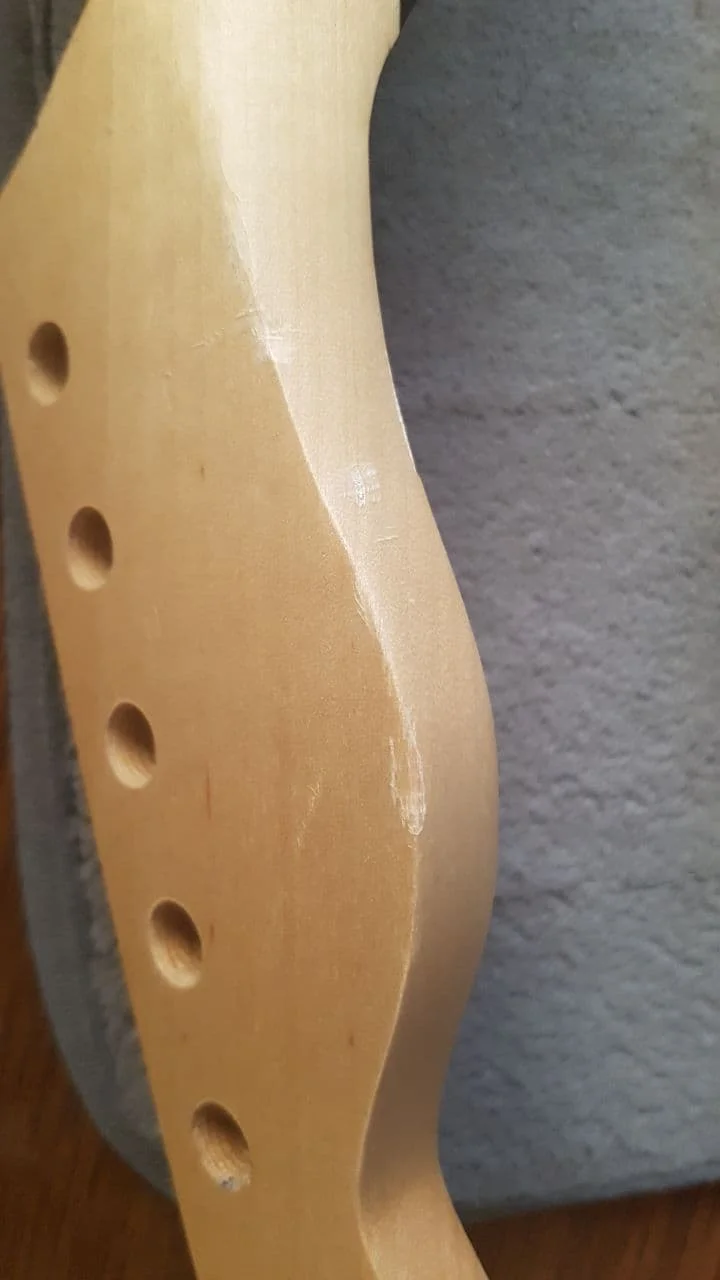 Очень плохое упаковочное дно сумки было распорано, и, по всей видимости, горловина гитары была опущена, что привело к большому плоскому вмятину ниже последнего Лада, а также в головном запасе необычный цвет зерна иногда некоторые люди могут подумать, что это круто, но я не возвращаю его