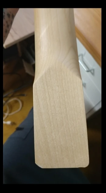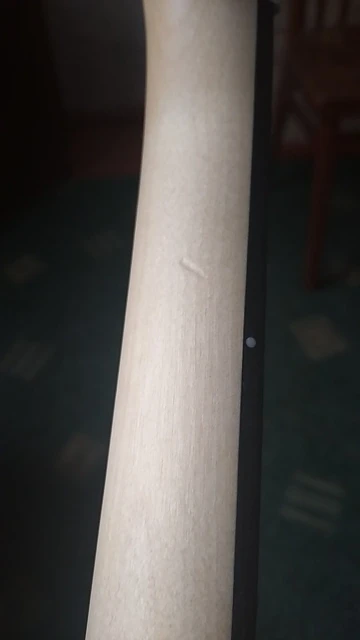 Выглядит хорошо, на вид ровный, не винтом. Цвет, фактура, лады неплохие. Есть небольшие огрехи на кромках отверстий, но они скроются шайбами колков. Самая большая проблема - состояние после доставки. Товар пришёл в стандартном пакете, обёрнут в небольшой кусок картона, который не защитил товар с торцов, где он оказался побит. В моём случае он выглядит лучше, чем в отзывах рядом здесь, но накладка после последнего лада обколота маленько. В целом, я ставлю пять звёзд, но надо иметь ввиду, что бесплатную доставку выбирать нельзя. Смотрите внимательно на это.