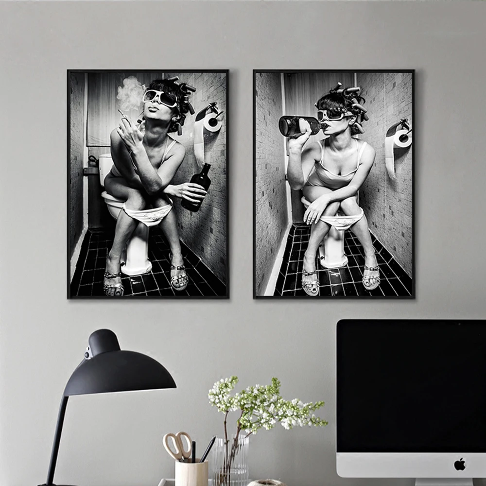 Сексуальная Девушка сидит в туалете холст художественные плакаты и принты черно-белая холст настенные картины для ванной