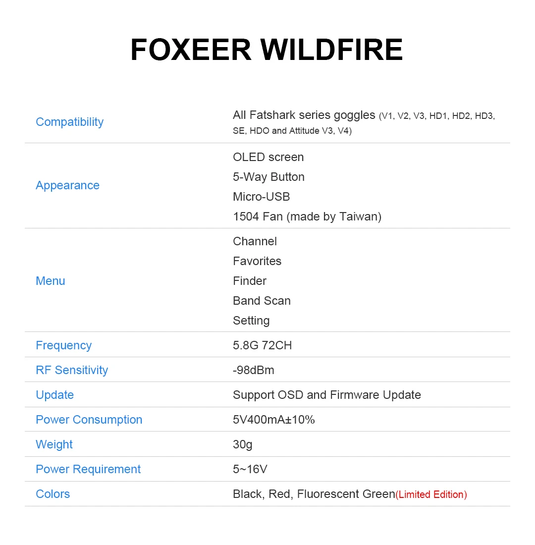 Описание: Бренд: Foxeer Название товара: наземная станция Wildfire Цвет(Необязательно): Черный, флуоресцентный зеленый(Ограниченная серия) Частота: 5,8G 72CH Чувствительность RF: -98 дБм Обновление: Поддержка OSD и обновления прошивки Потребляемая мощность: 5 В 400мА ± 10% Потребляемая мощность: 5 ~ 16 В Вес: 30 г Совместимость: Все очки Fatshark (V1,V2,V3,HD1,HD2,HD3,SE,HDO и Attitude V3,V4) Внешний вид: OLED-экран, 5-сторонняя кнопка, Micro-USB, 1504 вентилятор (Сделано в Тайване) Меню: канал, избранное, искатель, сканирование полосы, настройка Посылка входит: 1x наземная станция Foxeer Wildfire