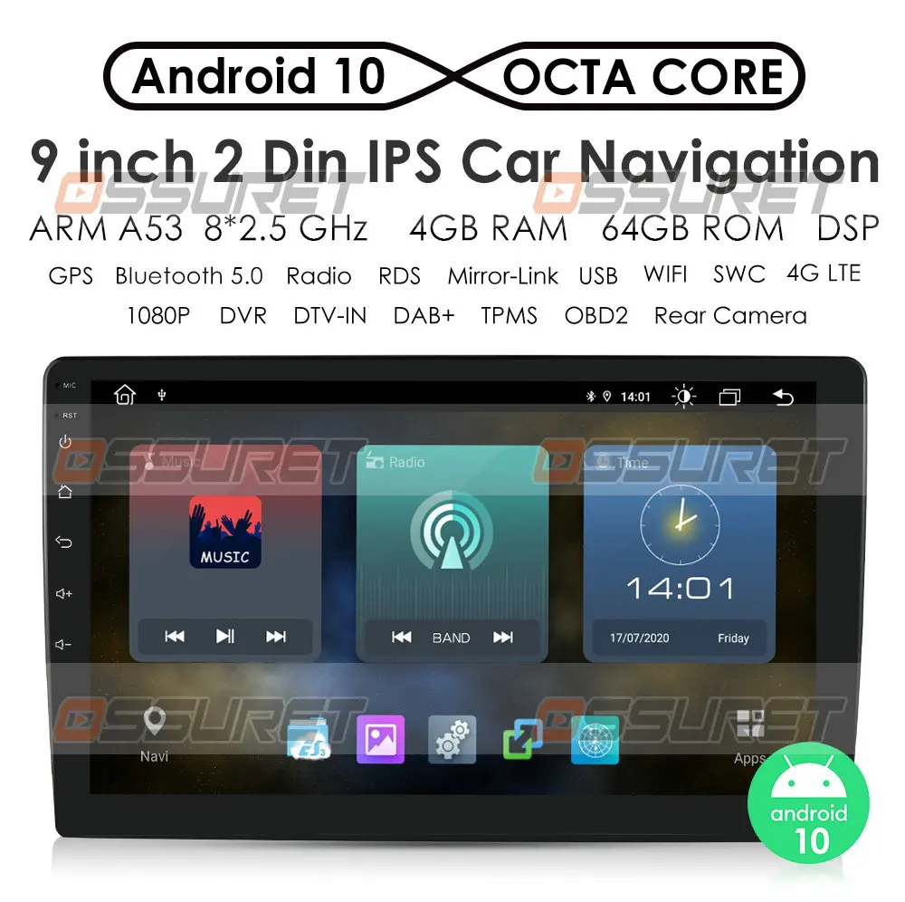 Автомагнитола 2DIN, универсальная мультимедийная система на Android 10, с 9 "IPS экраном, 4 Гб ОЗУ, 64 Гб ПЗУ, GPS, Bluetooth, Wi-Fi, MirrorLink, OBD2
