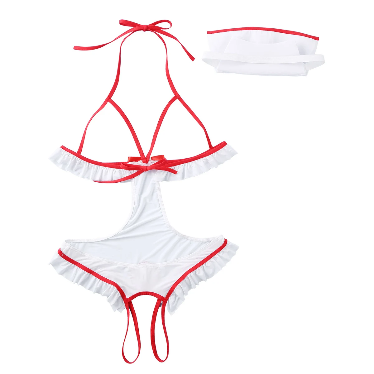 Особенности: Женский костюм для косплея озорной девушки, комплект нижнего белья для ролевых игр, лестно и привлекательно. Вырез на шее, открытые чашечки, дизайн с вырезами спереди и оборками ниже бюста, открытая спина с завязками на спине, вырезами и оборками на ногах. В комплекте с повязкой на голову с нашивкой Красного Креста. Легкая и дышащая ткань, хорошо тянущаяся, очень мягкая и удобная в носке. Вечерние костюмы, ночная Клубная одежда, вечерние костюмы для косплея, ролевые игры, ночное белье и т. Д. Перед покупкой проверьте таблицу размеров, рекомендуется ручная стирка.