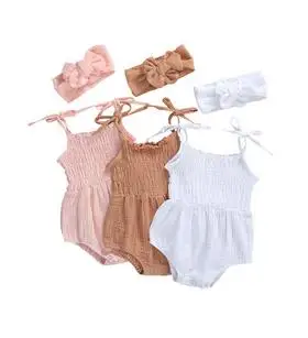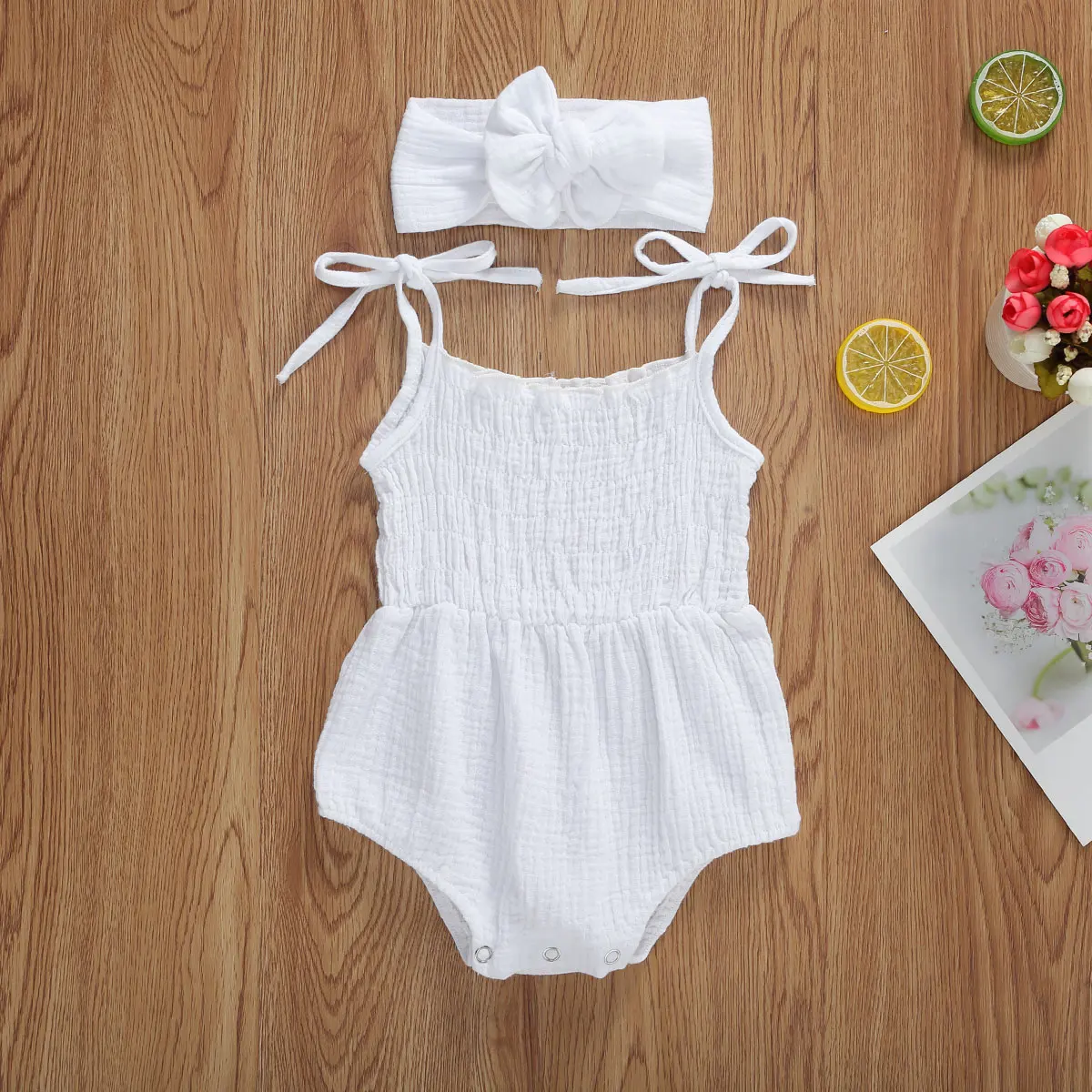 Комбинезон для новорожденных девочек и мальчиков 0-24 месяцев, однотонный хлопковый льняной комбинезон без рукавов на бретелях + повязка на голову