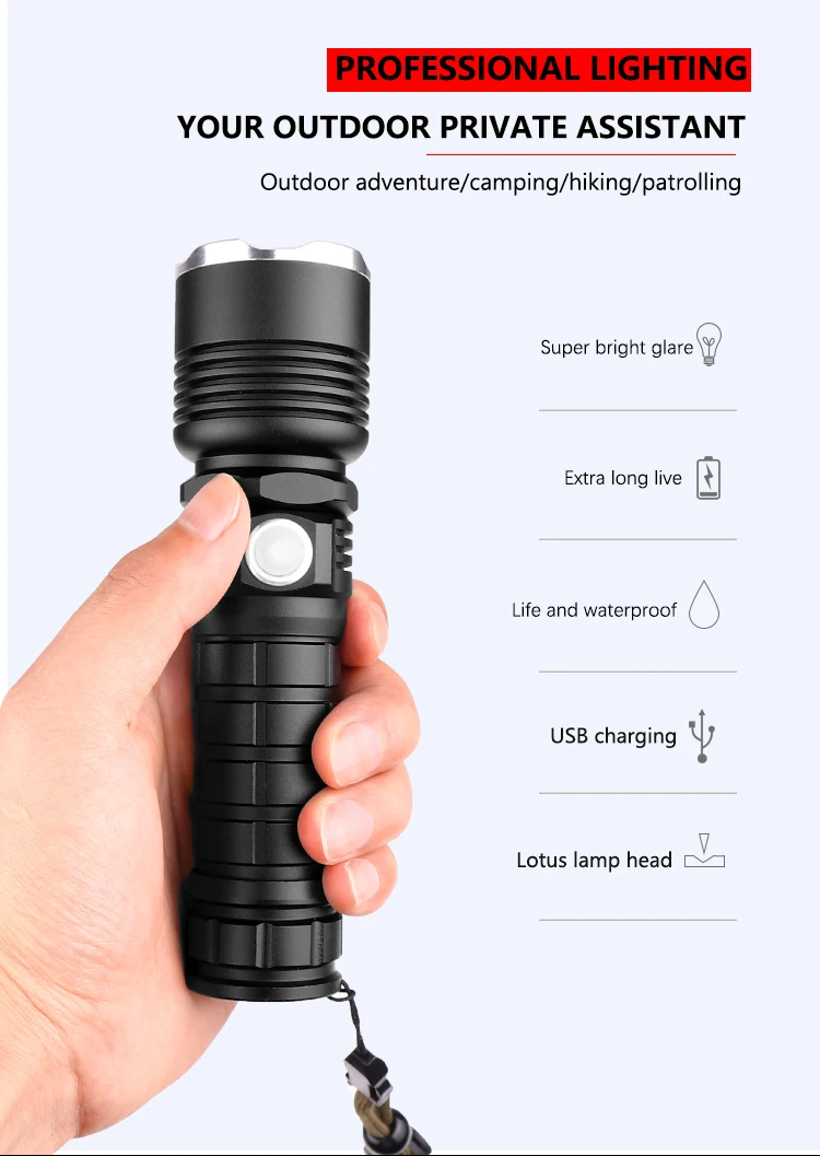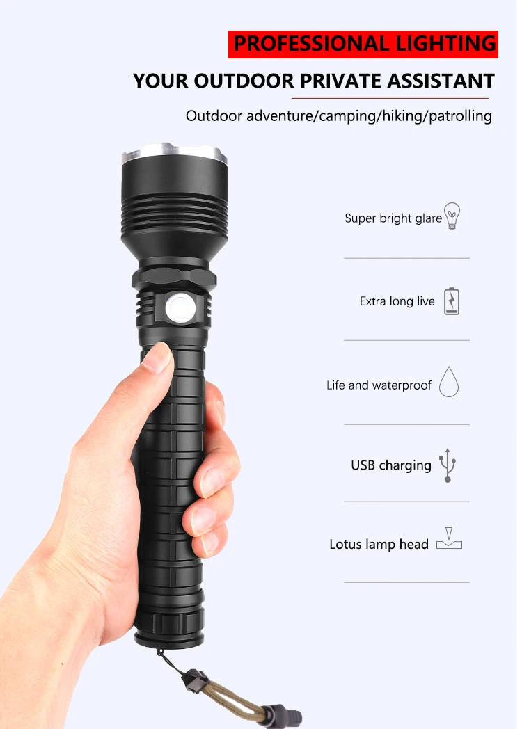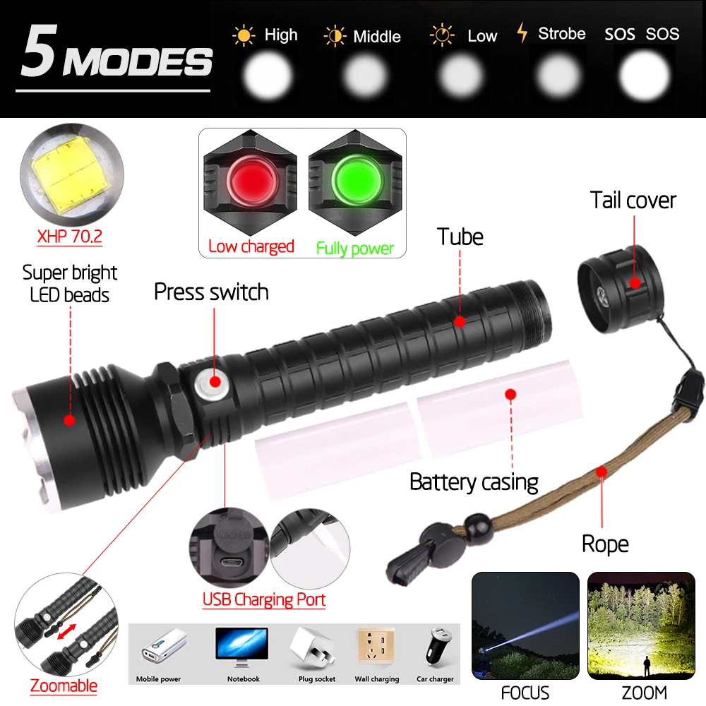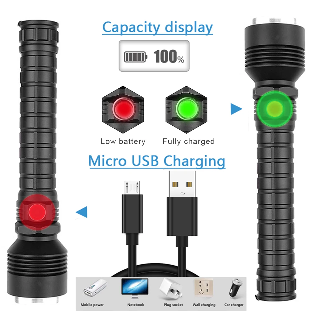 Мощный светодиодный фонарик использует XLamp XHP50 светодиодный для максимальной мощности до 50000 люмен Увеличьте аккумуляторный отсек 1*18650, чтобы продлить время работы. Отображение емкости аккумулятора, телескопический зум Micro usb для компьютера USB, автомобильный USB, USB-разъем для зарядки, зарядный фонарик Изготовлен из алюминиевого сплава аэродинамического класса, надежный Жесткий анодированный военный класс HAIII Водонепроницаемый в соответствии с IPX-6, водостойкий, можно использовать в дождливую погоду, но нельзя класть в воду Подходит для работы, охоты, скалолазания, рыбалки, кемпинга, активного отдыха и т. Д. Ударопрочность до 2 метров