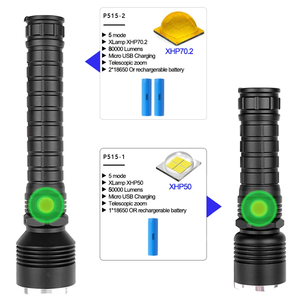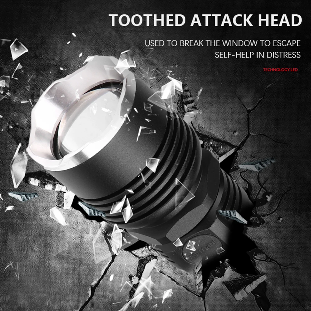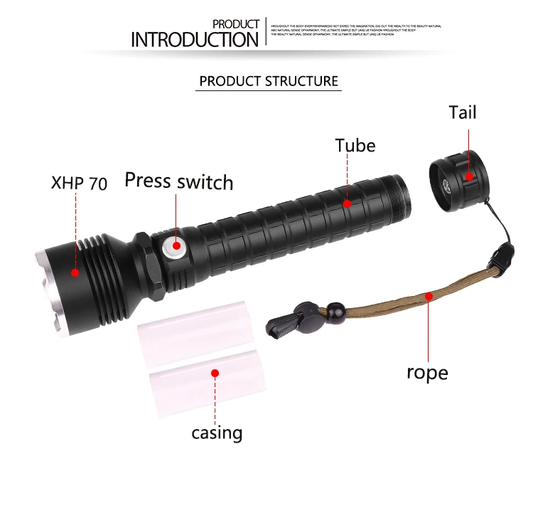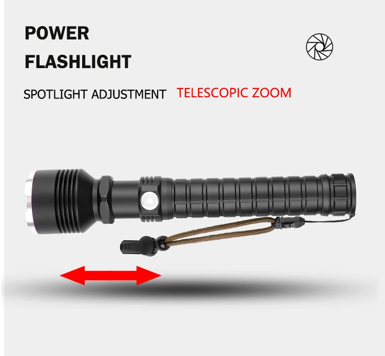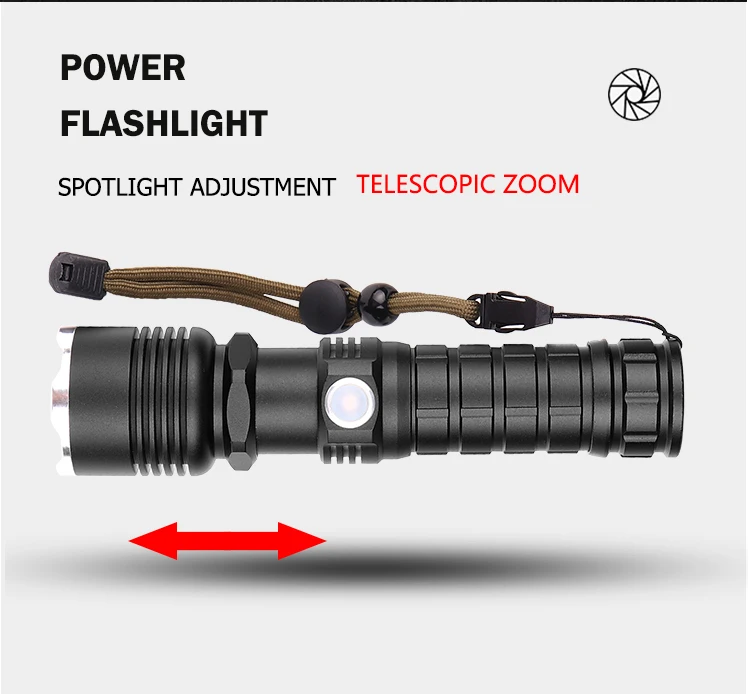 Мощный светодиодный фонарик использует XLamp XHP50 светодиодный для максимальной мощности до 50000 люмен Увеличьте аккумуляторный отсек 1*18650, чтобы продлить время работы. Отображение емкости аккумулятора, телескопический зум Micro usb для компьютера USB, автомобильный USB, USB-разъем для зарядки, зарядный фонарик Изготовлен из алюминиевого сплава аэродинамического класса, надежный Жесткий анодированный военный класс HAIII Водонепроницаемый в соответствии с IPX-6, водостойкий, можно использовать в дождливую погоду, но нельзя класть в воду Подходит для работы, охоты, скалолазания, рыбалки, кемпинга, активного отдыха и т. Д. Ударопрочность до 2 метров