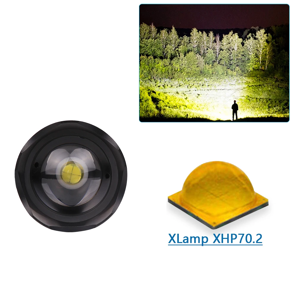 Мощный светодиодный фонарик использует XLamp XHP70.2 светодиодный. Увеличьте аккумуляторный отсек 2*18650, чтобы продлить время работы. Отображение емкости аккумулятора, телескопический зум. Micro usb для компьютера USB, автомобильного USB, USB-разъема для зарядки, зарядного фонарика. Изготовлен из алюминиевого сплава аэродинамического класса, надежный, жестко анодированный военный класс HAIII. Водонепроницаемый в соответствии с IPX-6, водостойкий, можно использовать в дождливую погоду, но нельзя класть в воду. Подходит для работы, охоты, скалолазания, рыбалки, кемпинга, активного отдыха и т. д. Ударопрочность до 2 метров.