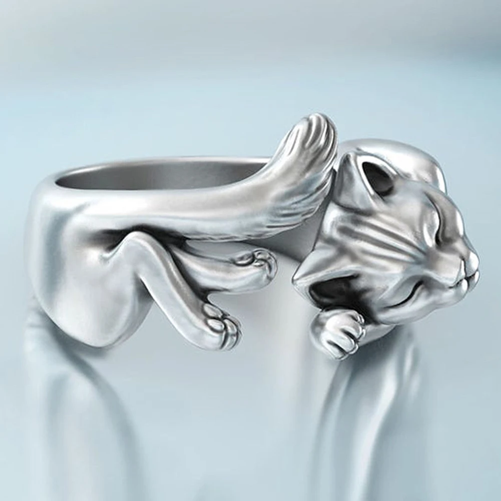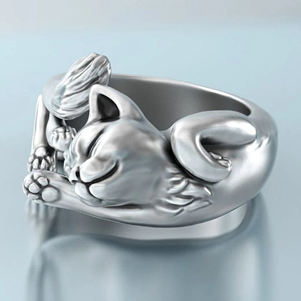 Винтажное посеребренное Открытое кольцо на палец в стиле унисекс со спящими кошками, ювелирное изделие в подарок, уникальное Стильное кольцо для мужчин и женщин, винтажное Открытое кольцо на палец